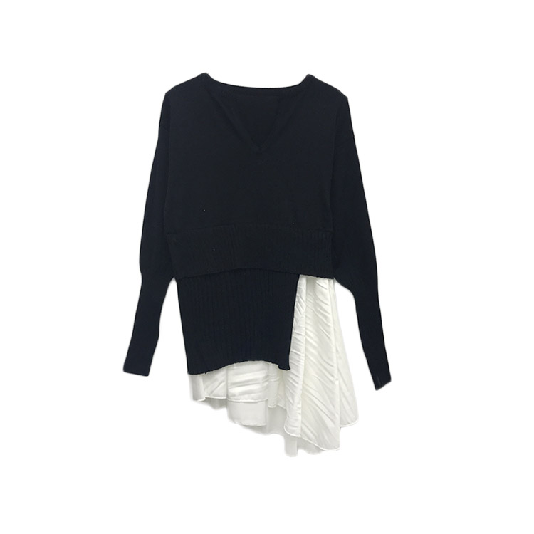 韓版毛衣女2018新款假兩件拼色半高領不規則喇叭袖襯衫針織衫上衣