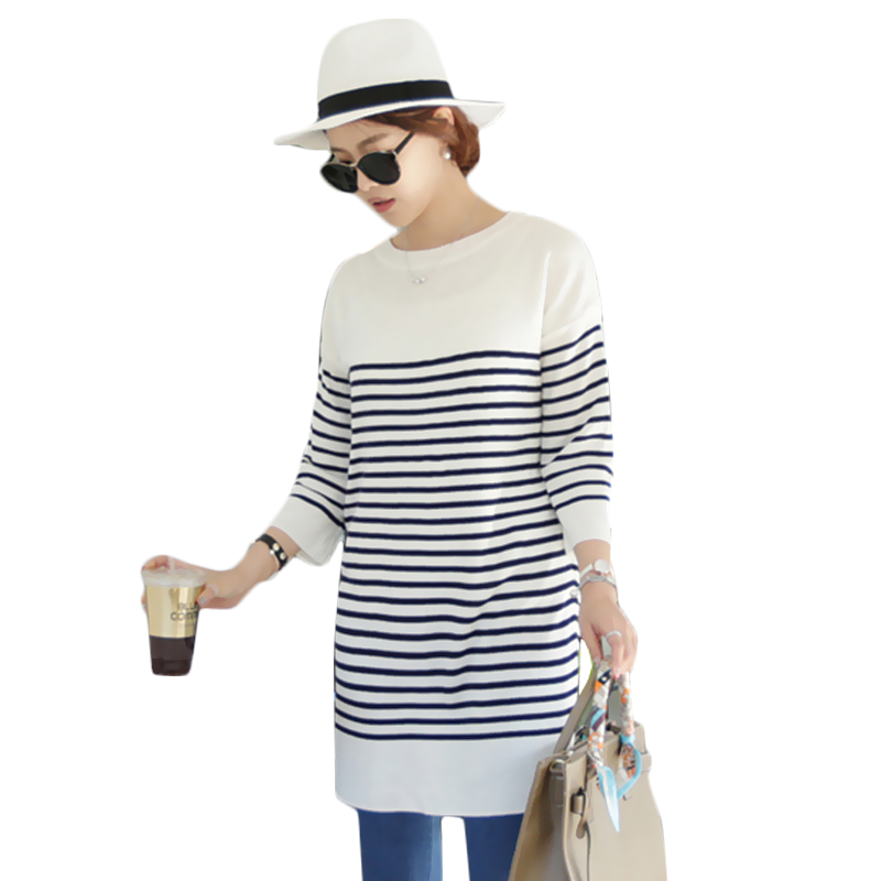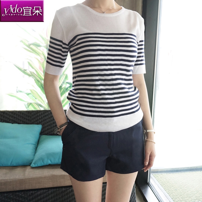 / 中長款短袖針織衫女春夏新款中袖條紋T恤針織衫套頭針織T恤女薄款