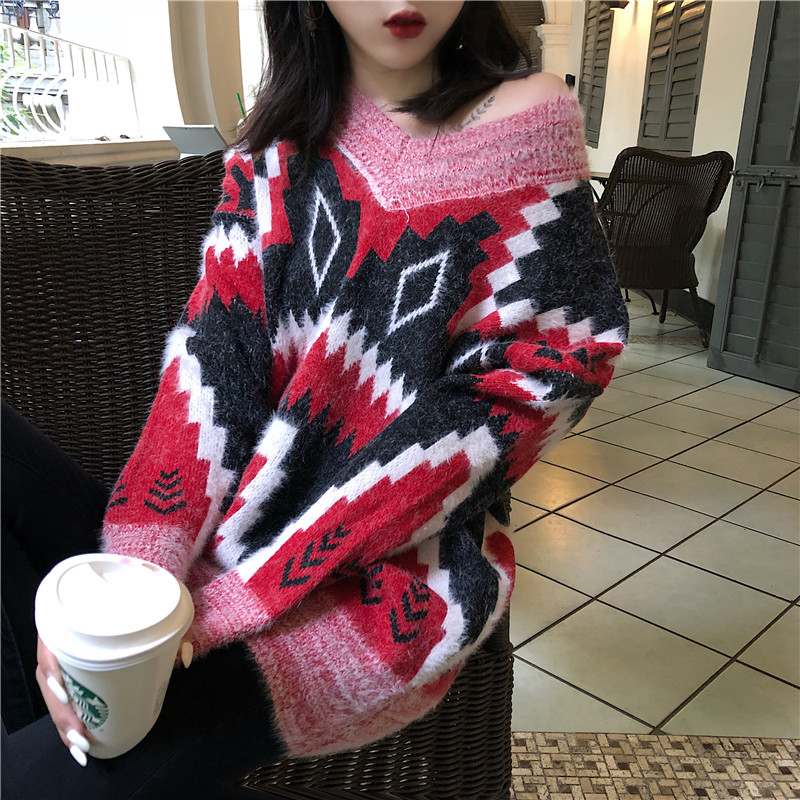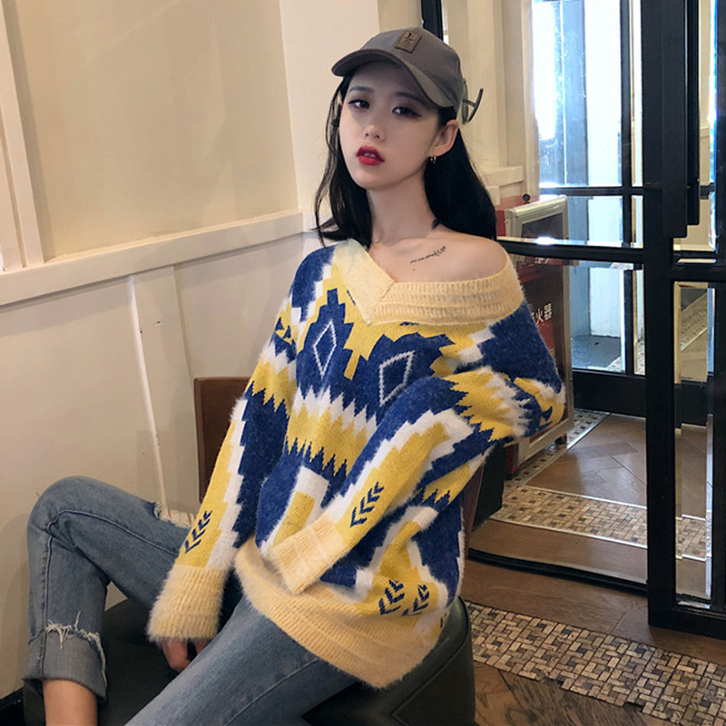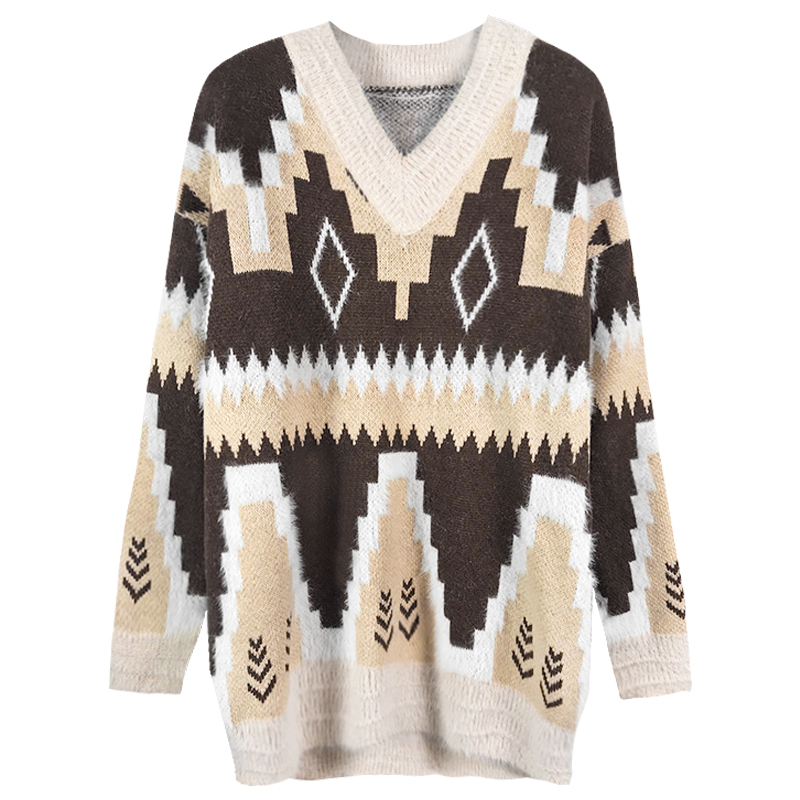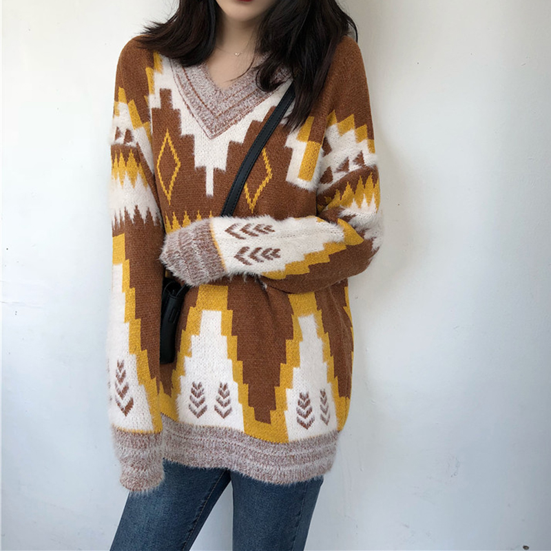 / 復古拼色圖案毛衣秋裝女2018新款慵懶寬松中長針織衫學生長袖上衣