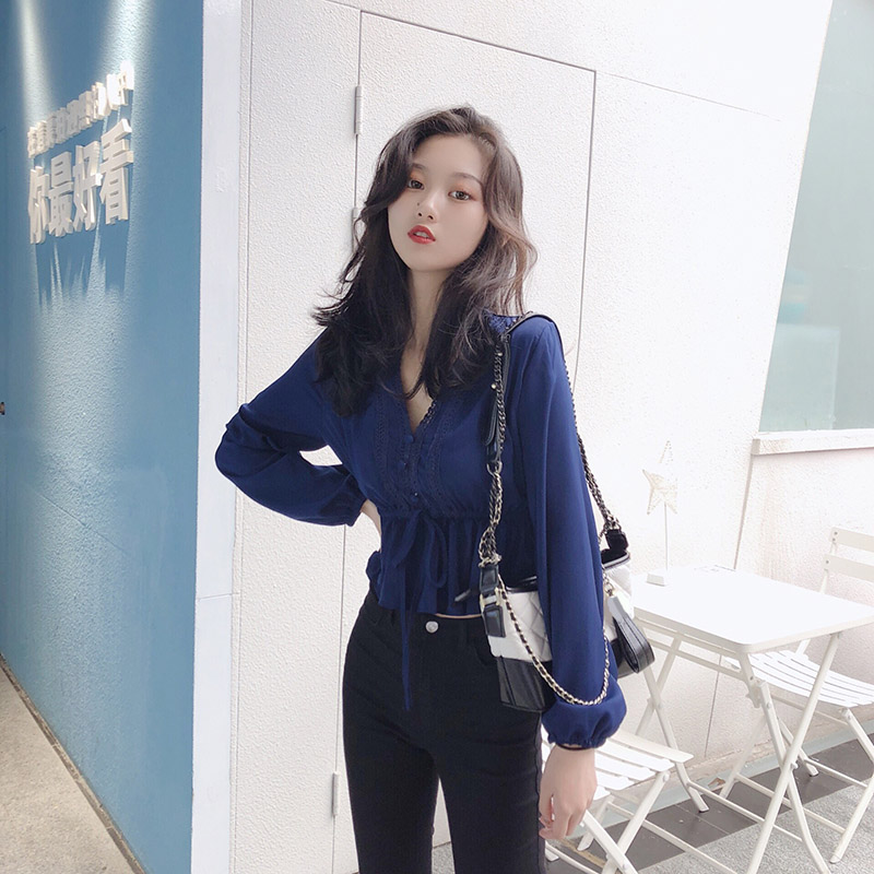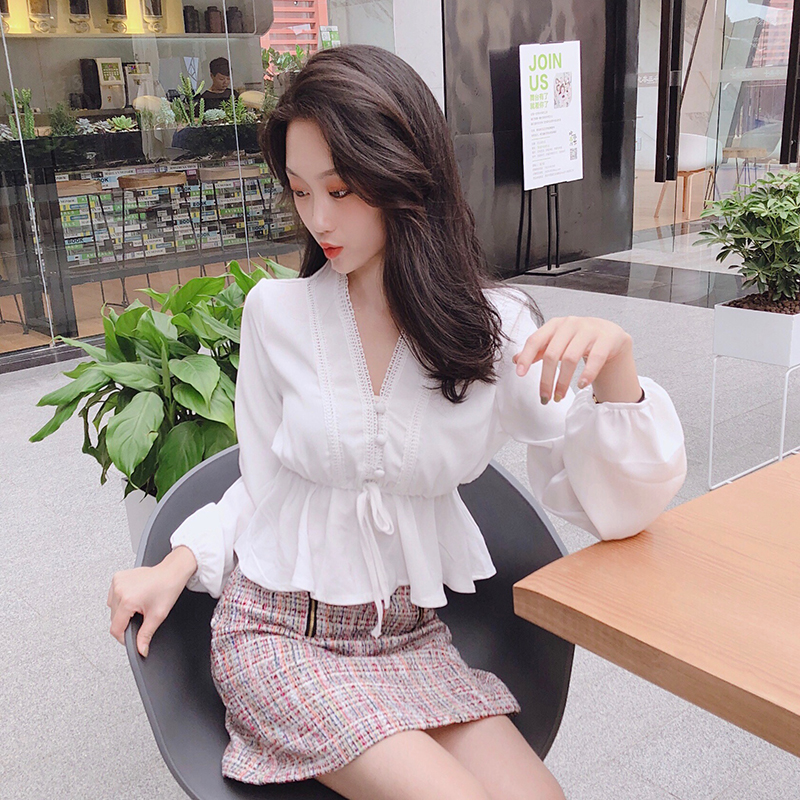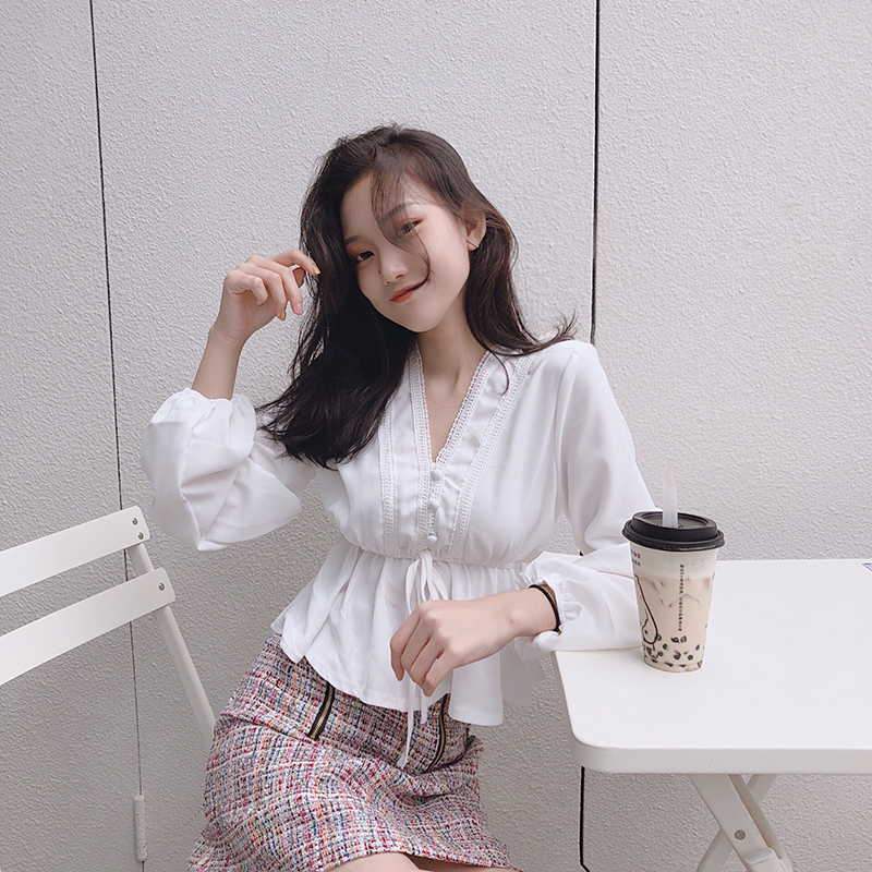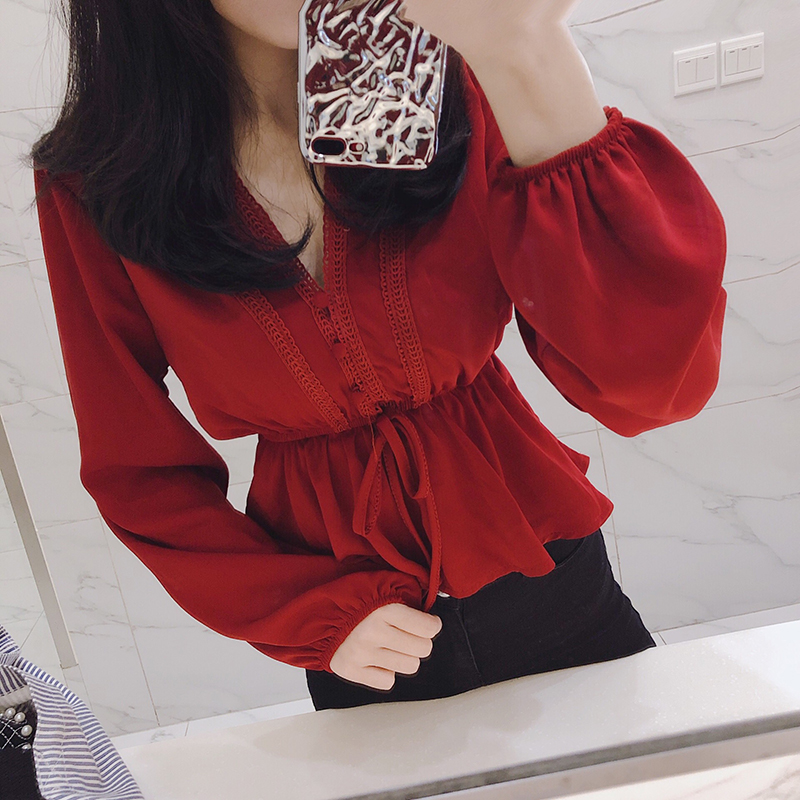 / 甜美氣質仙女新款chic上衣長袖V領雪紡花邊松緊收腰燈籠袖襯衫潮