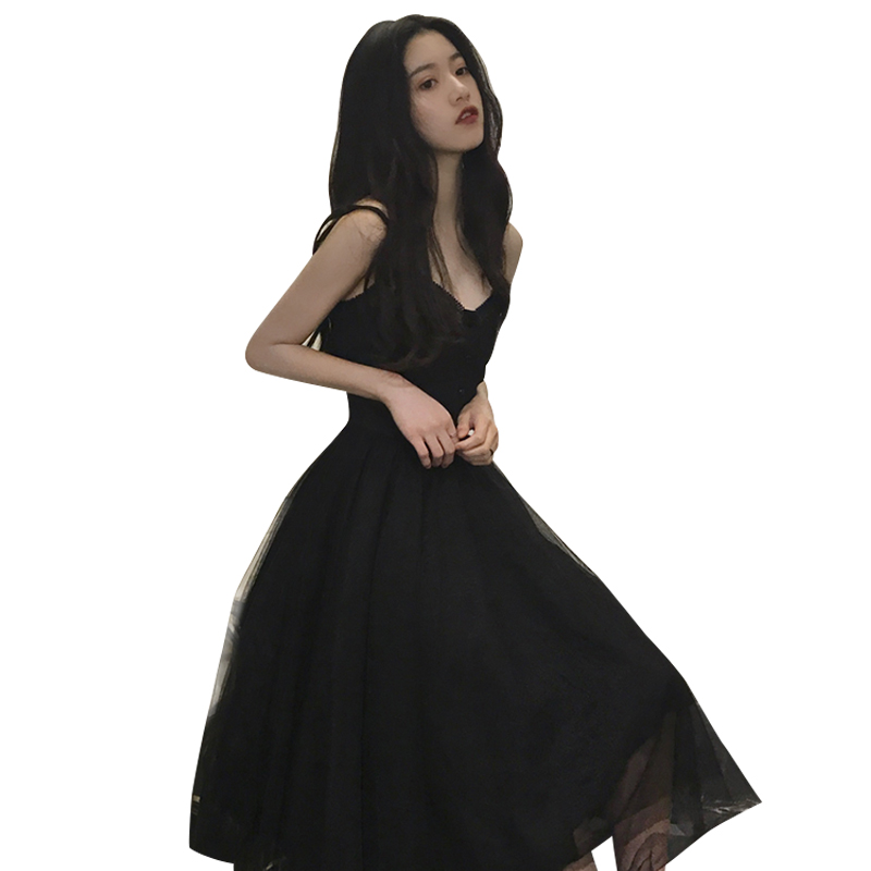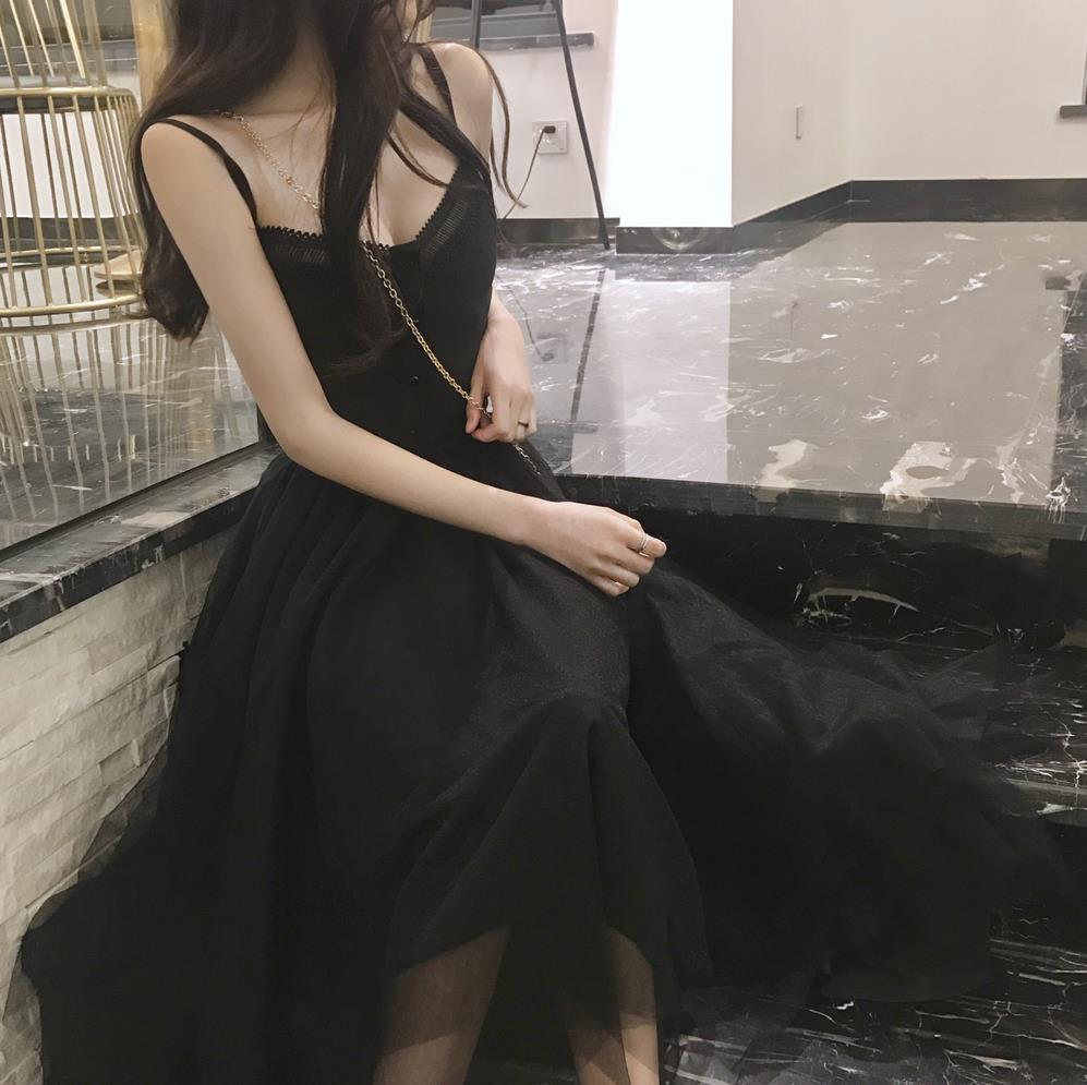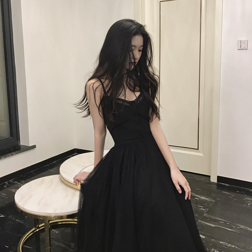 / 蕾絲吊帶拼接純色百搭時尚小心機設計感連衣裙仙女復古chic小黑裙