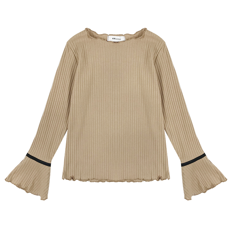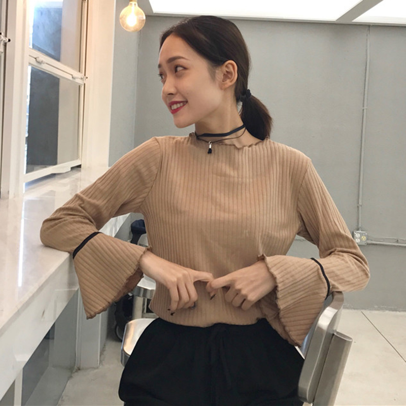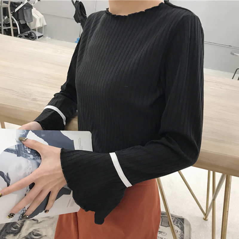 / 時尚坑條套頭針織衫秋裝女2018新款港味修身打底衫喇叭長袖短上衣
