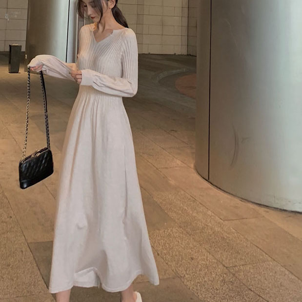 韓版初冬氣質溫柔風毛衣裙女冬裝2018新款女百搭顯腿長針織連衣裙