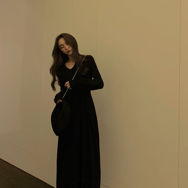 chic秋冬裙子長裙女慵懶風時尚韓系寬松百搭雪紡純色打底連衣裙女