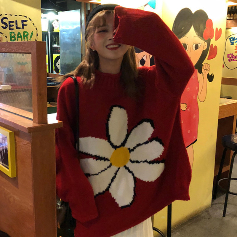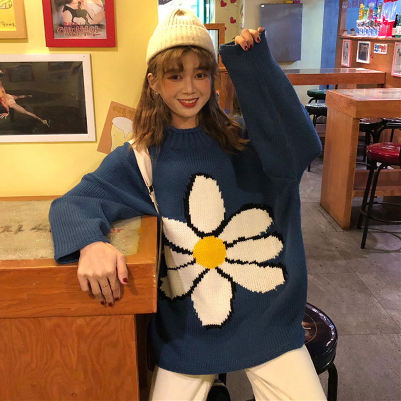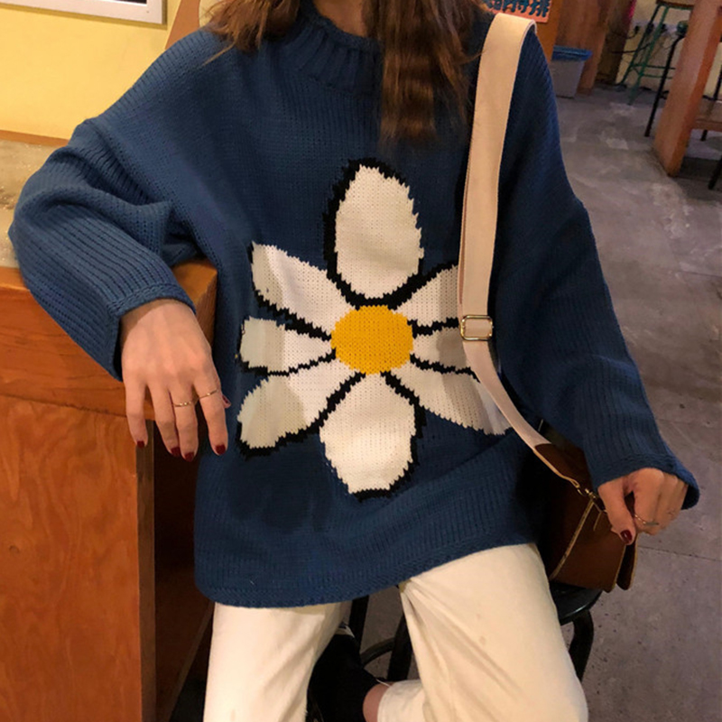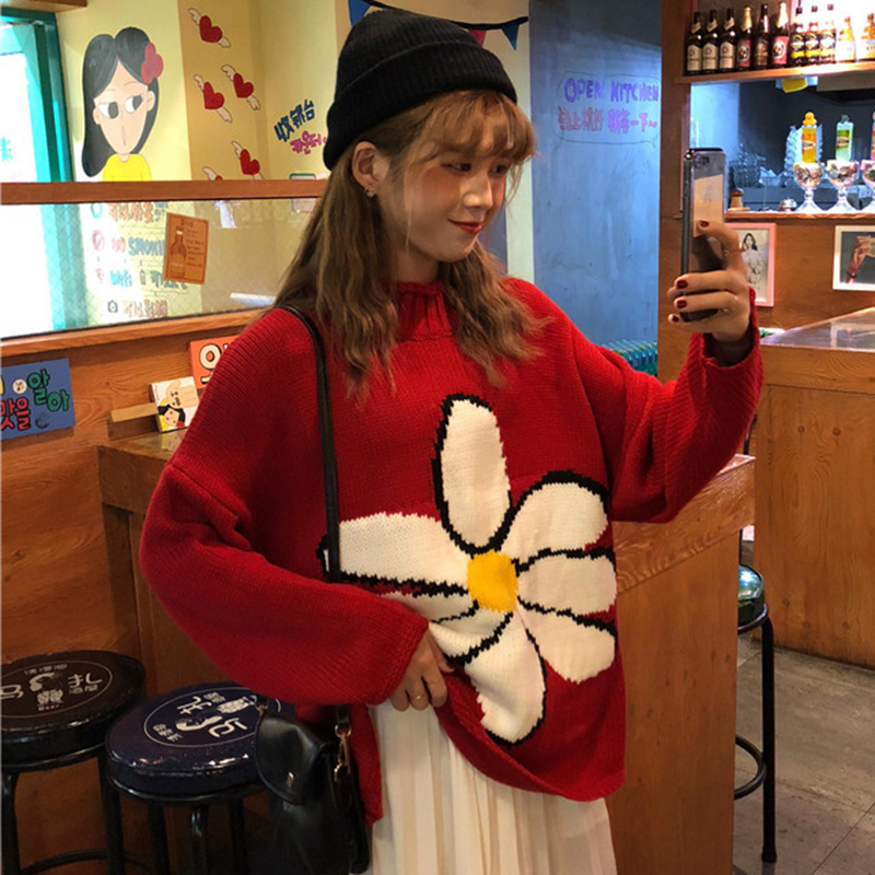 慵懶風半高領套頭針織衫女冬裝2018新款韓版寬松花朵提花毛衣外套