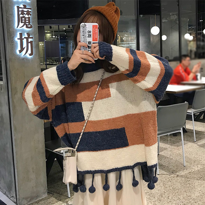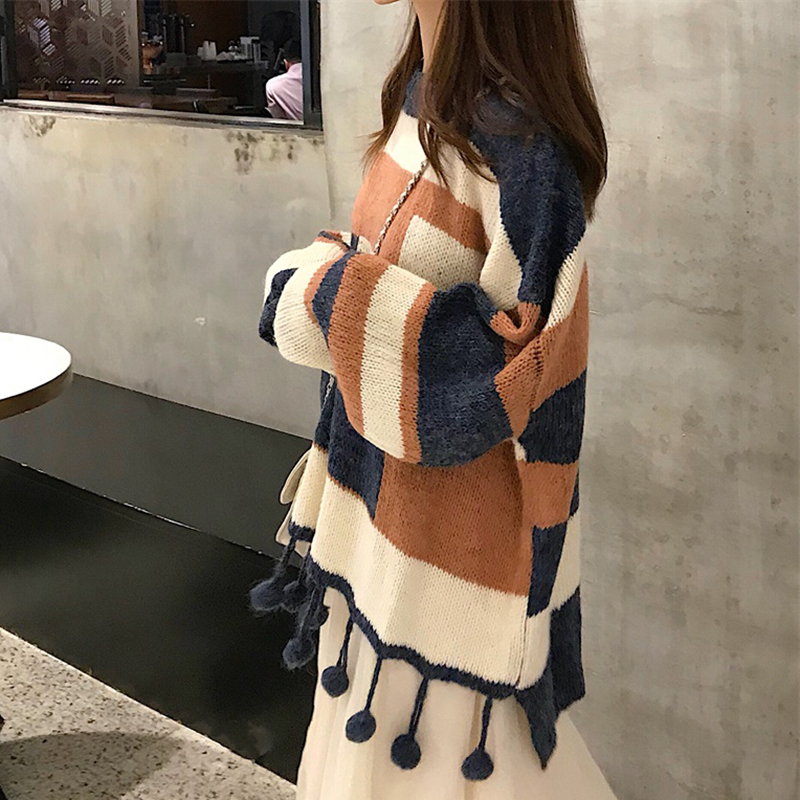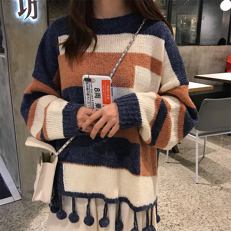 韓版拼色流蘇寬松毛衣女秋冬裝2018新款學生時尚針織外套慵懶上衣