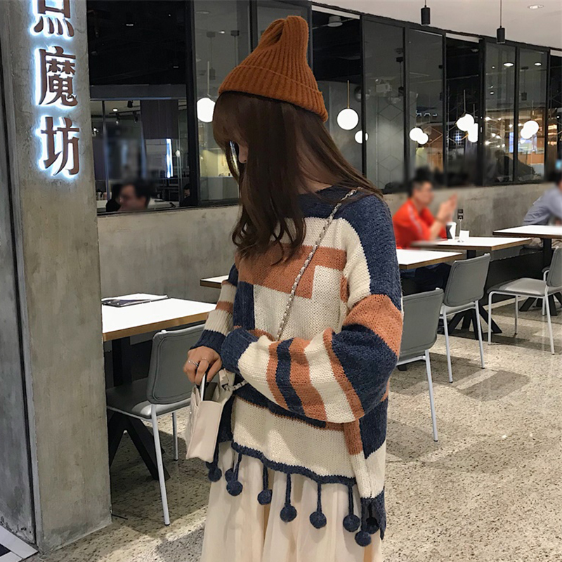 / 韓版拼色流蘇寬松毛衣女秋冬裝2018新款學生時尚針織外套慵懶上衣