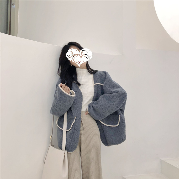 / 港味冬季加厚撞色條邊羊羔毛拼鹿皮絨百搭寬松保暖長袖外套女新款