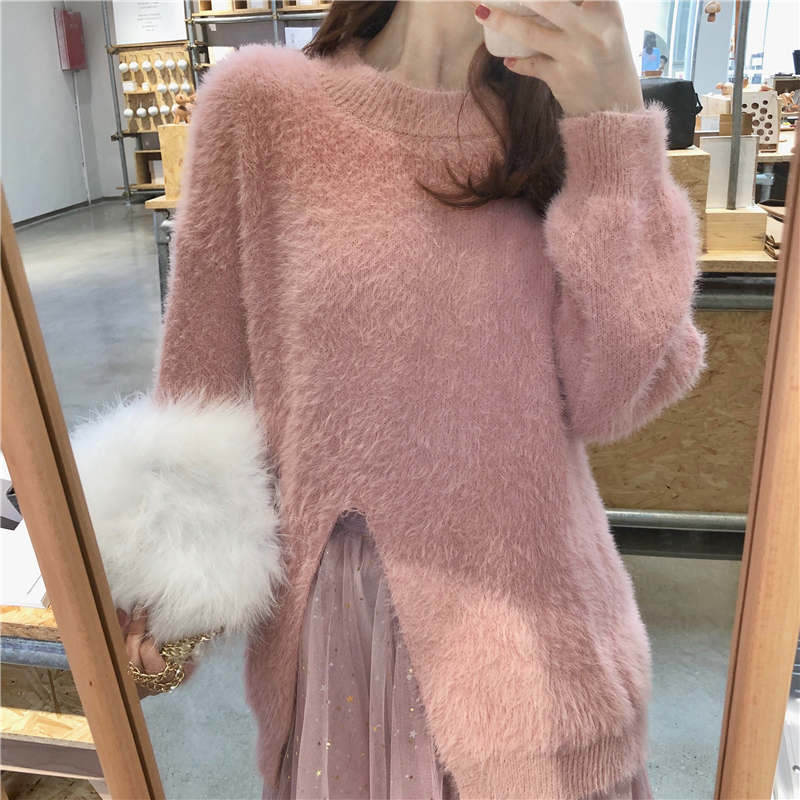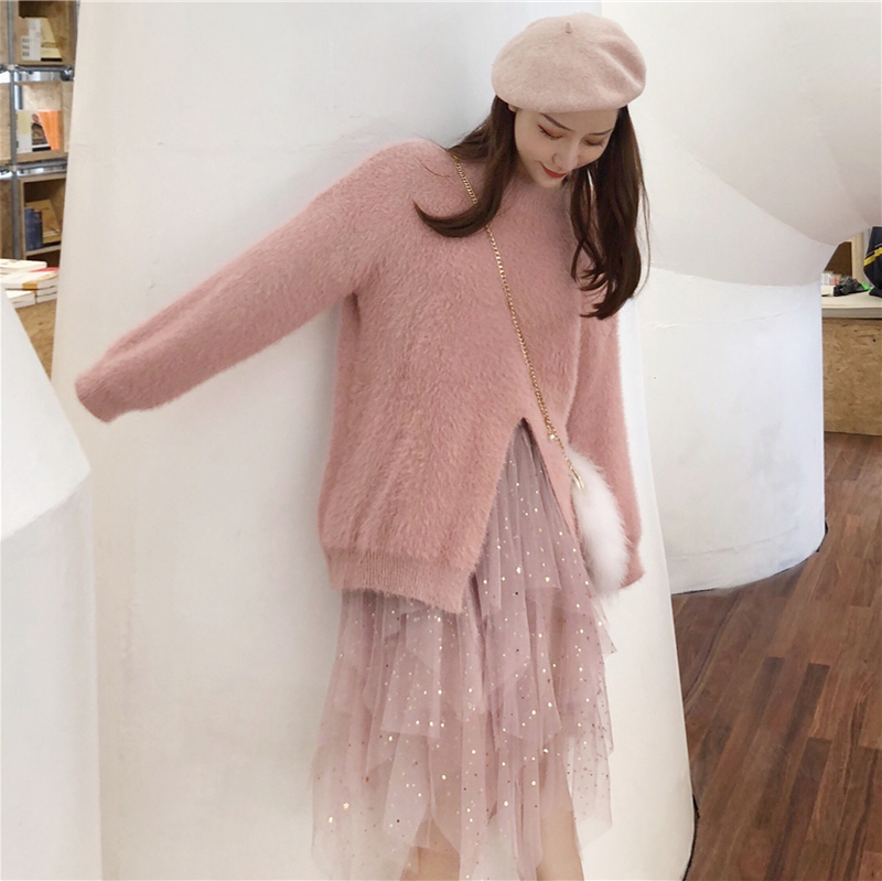 粉色毛衣|網紗半身裙