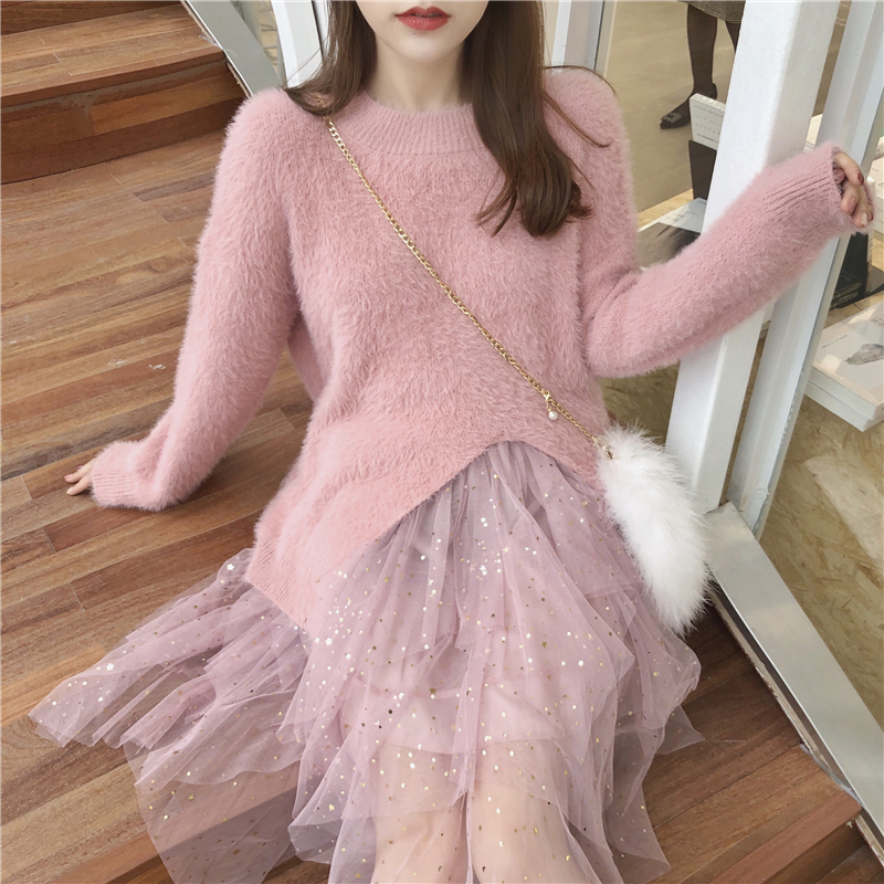 毛衣配裙子兩件套寬松開叉長袖針織衫高腰星月亮片網紗A字半身裙