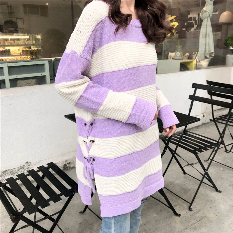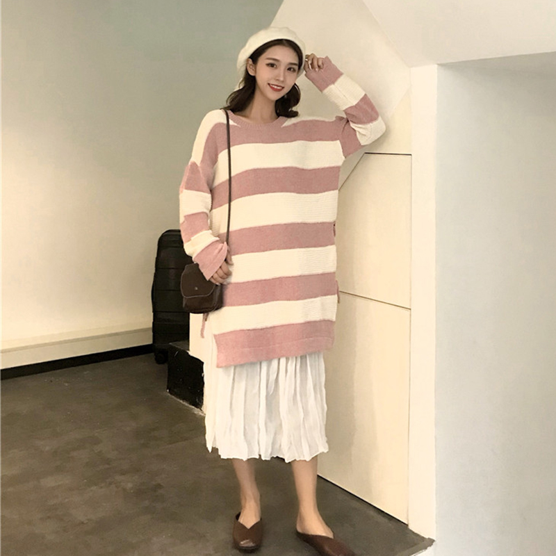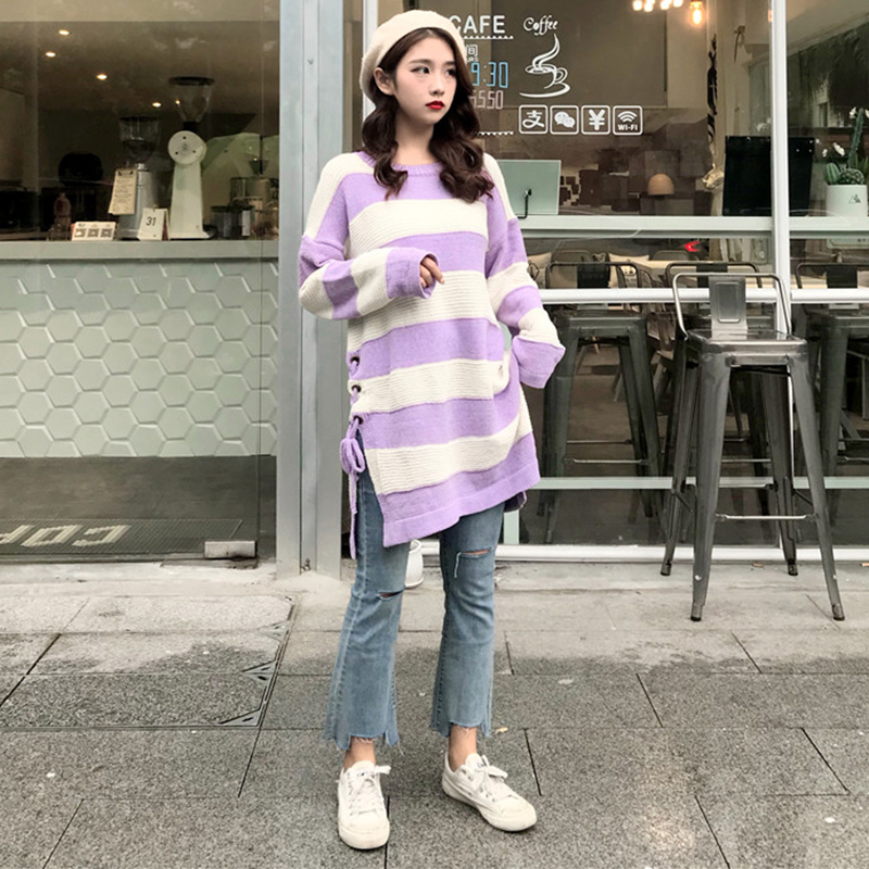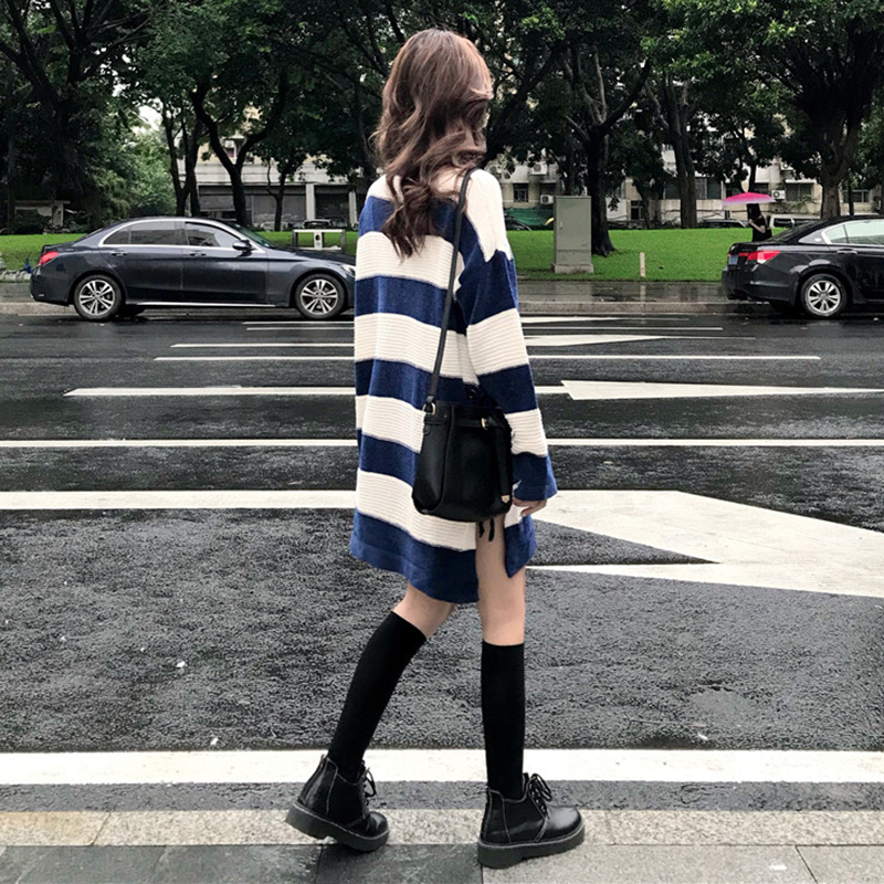 秋冬女裝2018新款慵懶拼色條紋針織衫中長款寬松網紅套頭毛衣外套