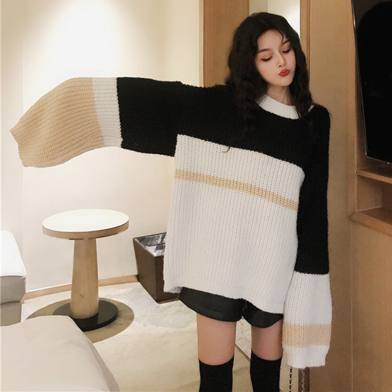 學生寬松毛衣女秋冬裝2018新款慵懶針織外套時尚拼色休閑長袖上衣