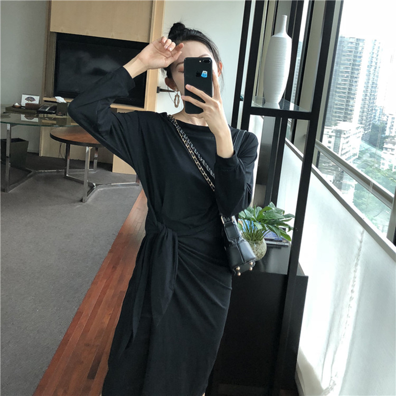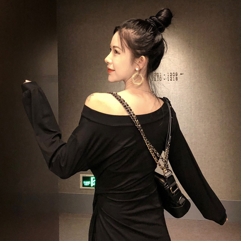 / 秋裝女新款修身氣質成熟長袖連衣裙顯瘦一字領不規則系帶中長裙子