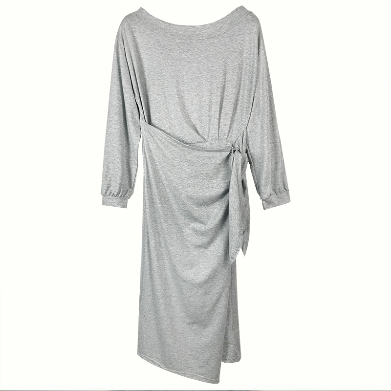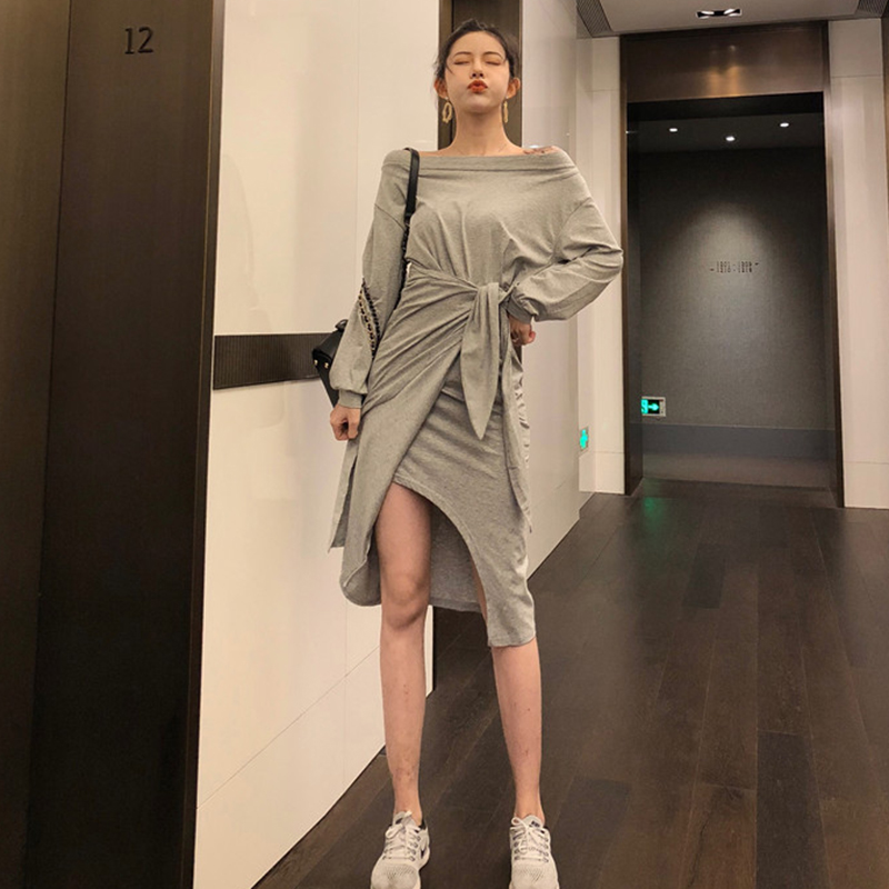 秋裝女新款修身氣質成熟長袖連衣裙顯瘦一字領不規則系帶中長裙子