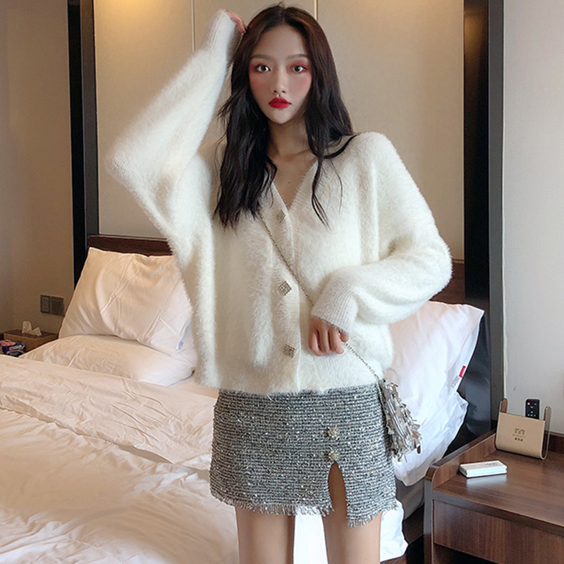/ 女神套裝秋2018新款慵懶毛衣外套長袖毛絨開衫高腰開叉銀絲半身裙