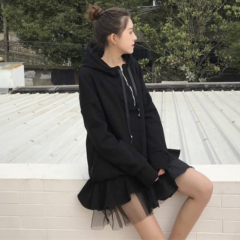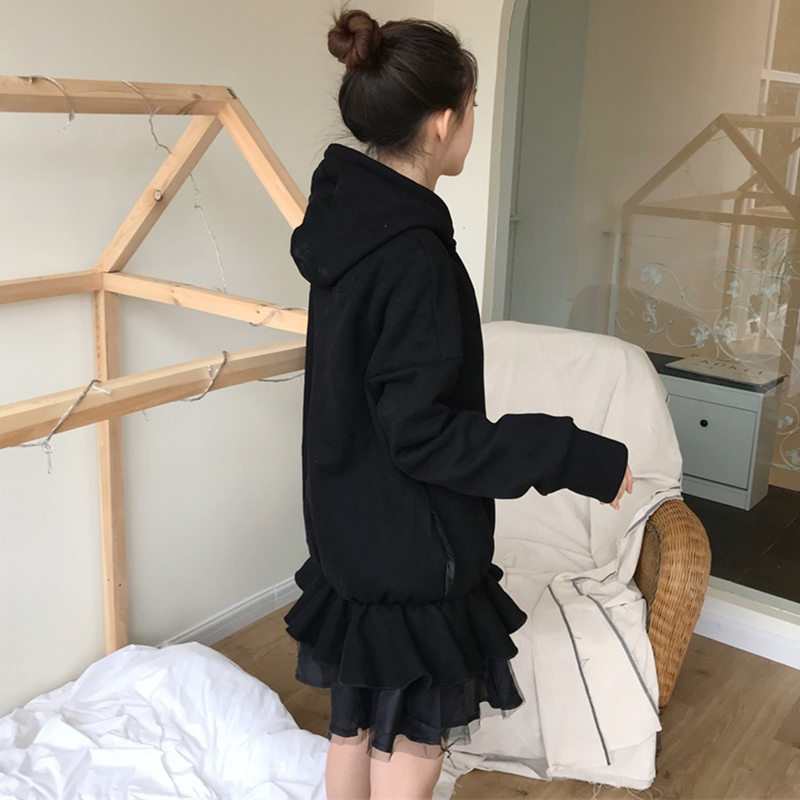 / 復古法式荷葉邊連衣裙子女秋冬裝新款網紗拼接時尚長袖連帽衛衣裙
