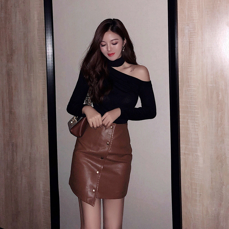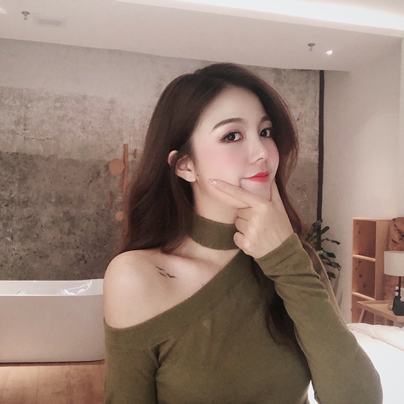 chic早秋針織衫復古修身顯瘦高領小心機氣質單肩露肩針織打底上衣