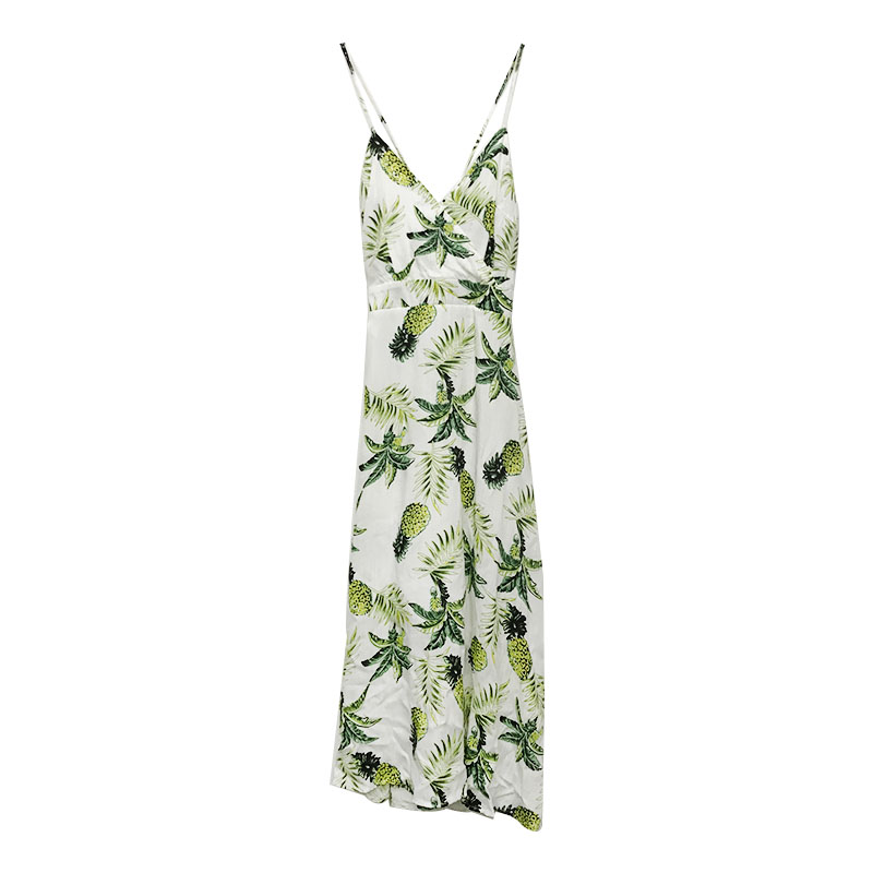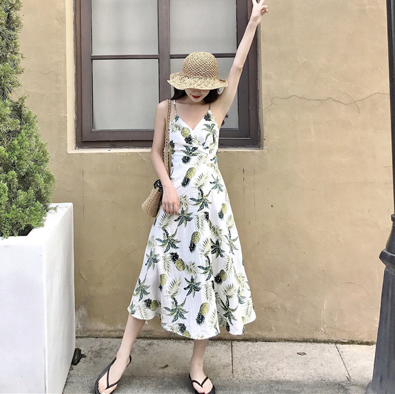 / 夏裝2018新款女溫柔氣質菠蘿顯瘦印花長裙百搭交叉露背吊帶連衣裙