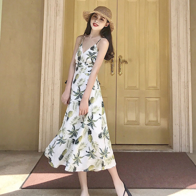 夏裝2018新款女溫柔氣質菠蘿顯瘦印花長裙百搭交叉露背吊帶連衣裙