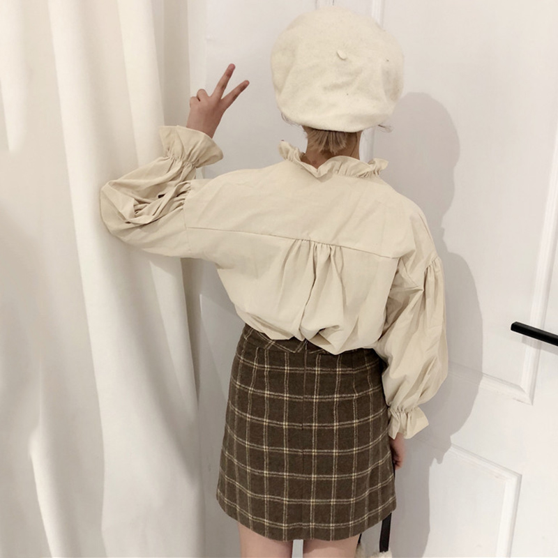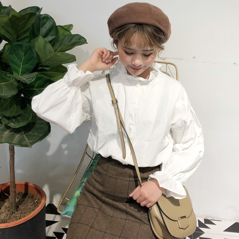/ 少女泡泡長袖白襯衫早秋新款女裝甜美百搭學生寬松荷葉領打底上衣