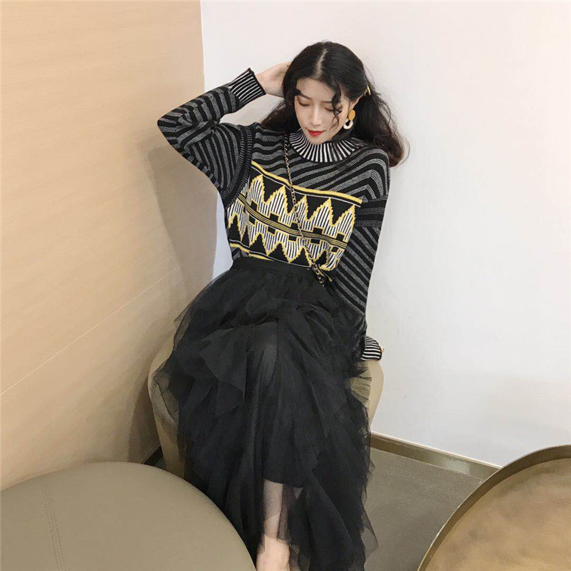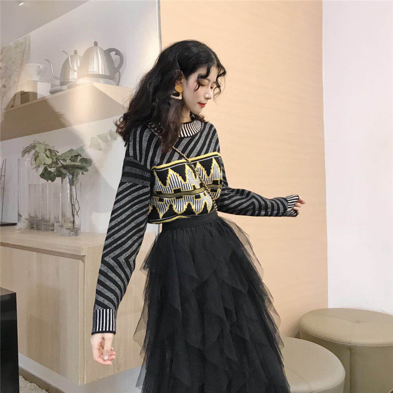 / 秋冬新款寬松幾何圖案印花毛衣時尚套裝高腰百搭網紗半身裙兩件套