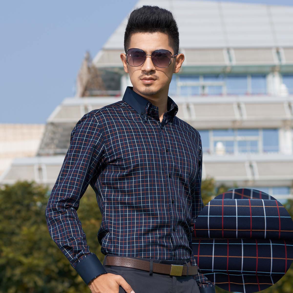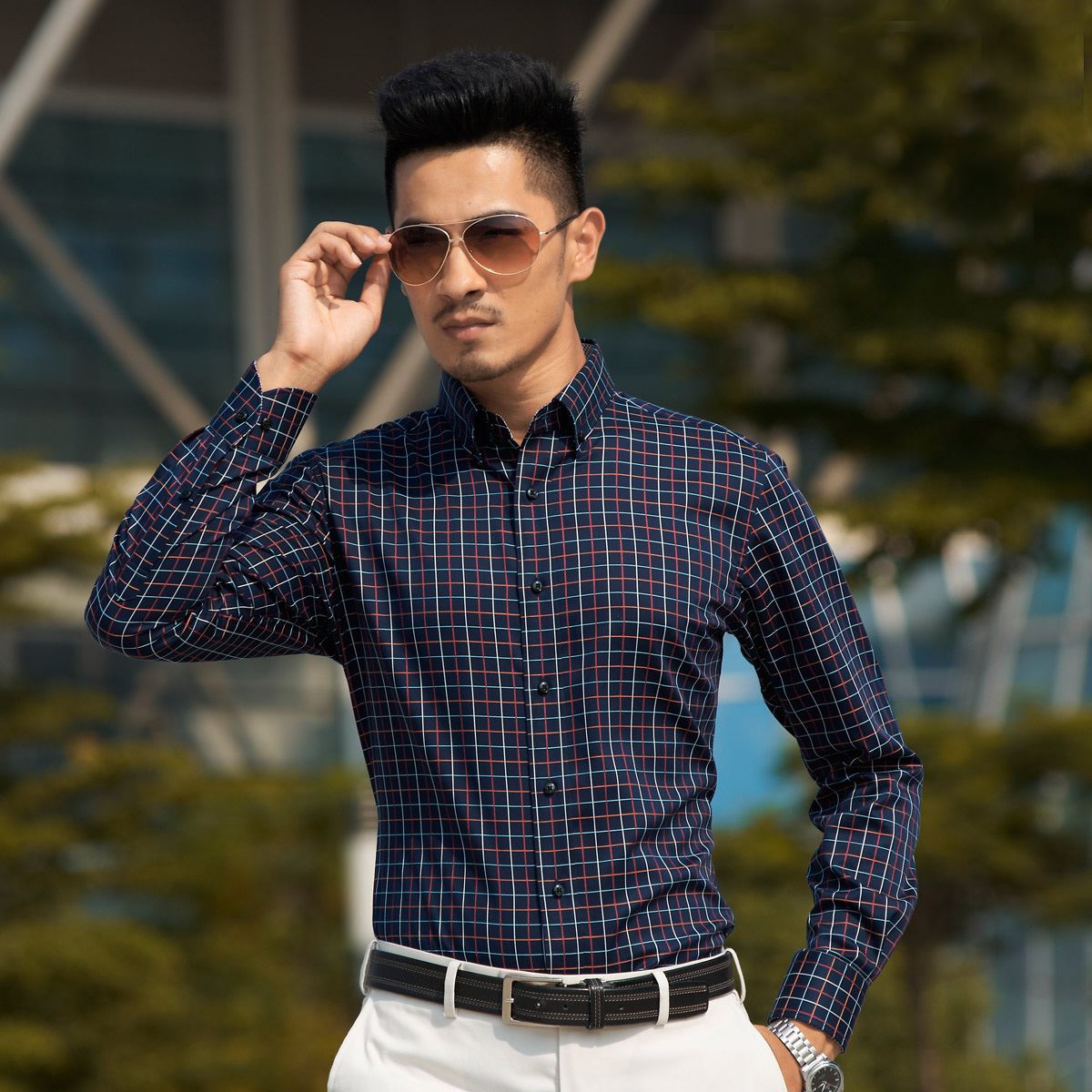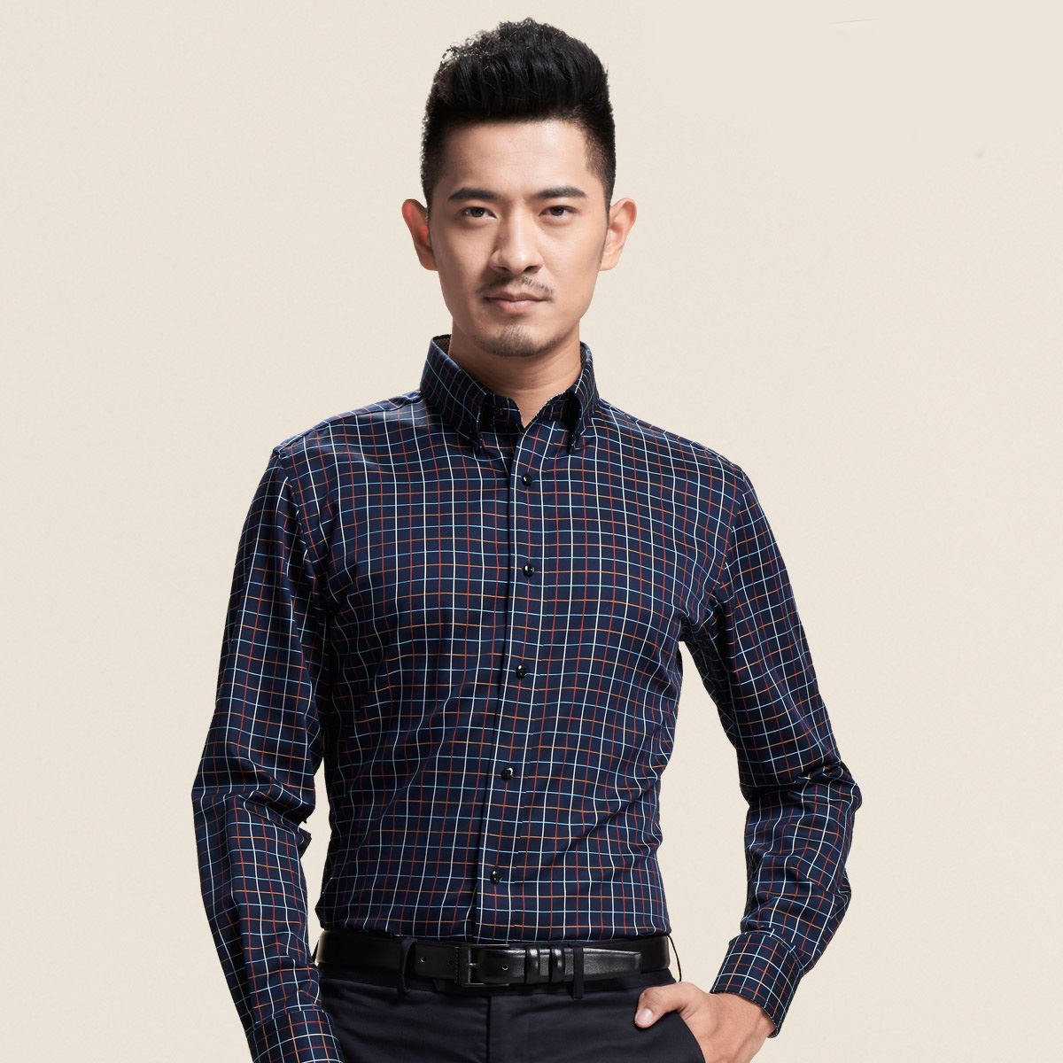 深海男士襯衫男 長袖深藍色大格子潮男式韓版修身休閑純棉 襯衣