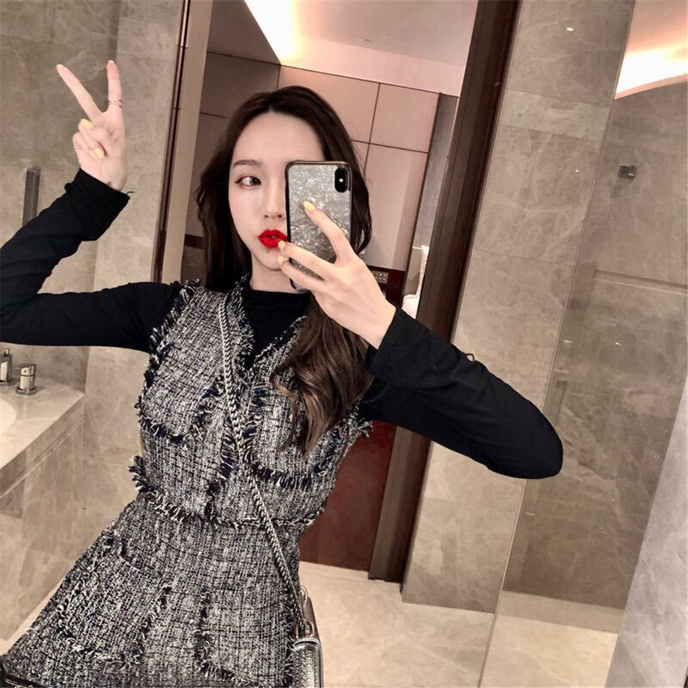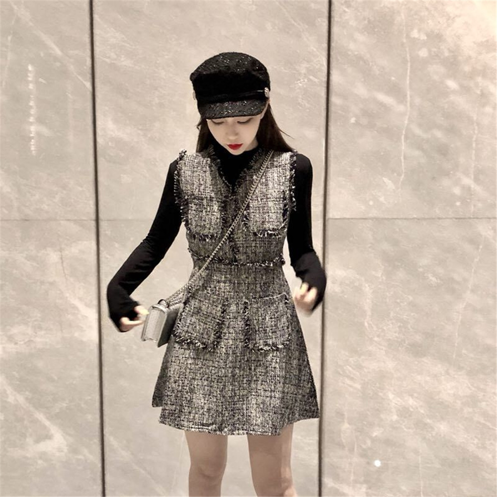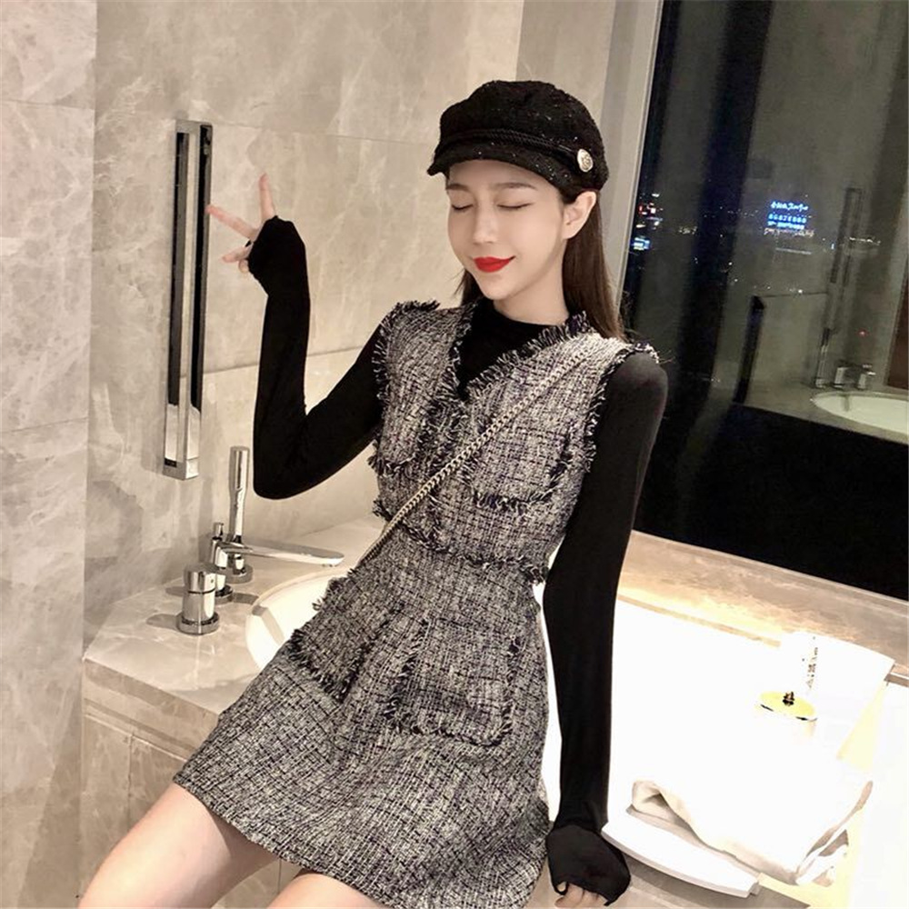 新款秋季名媛粗花格子兩件套連衣裙修身長袖打底衫T恤時尚套裝女