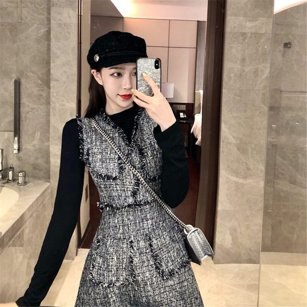 / 新款秋季名媛粗花格子兩件套連衣裙修身長袖打底衫T恤時尚套裝女