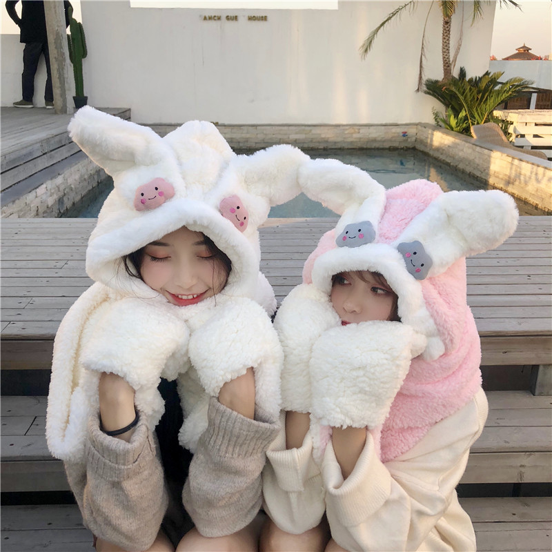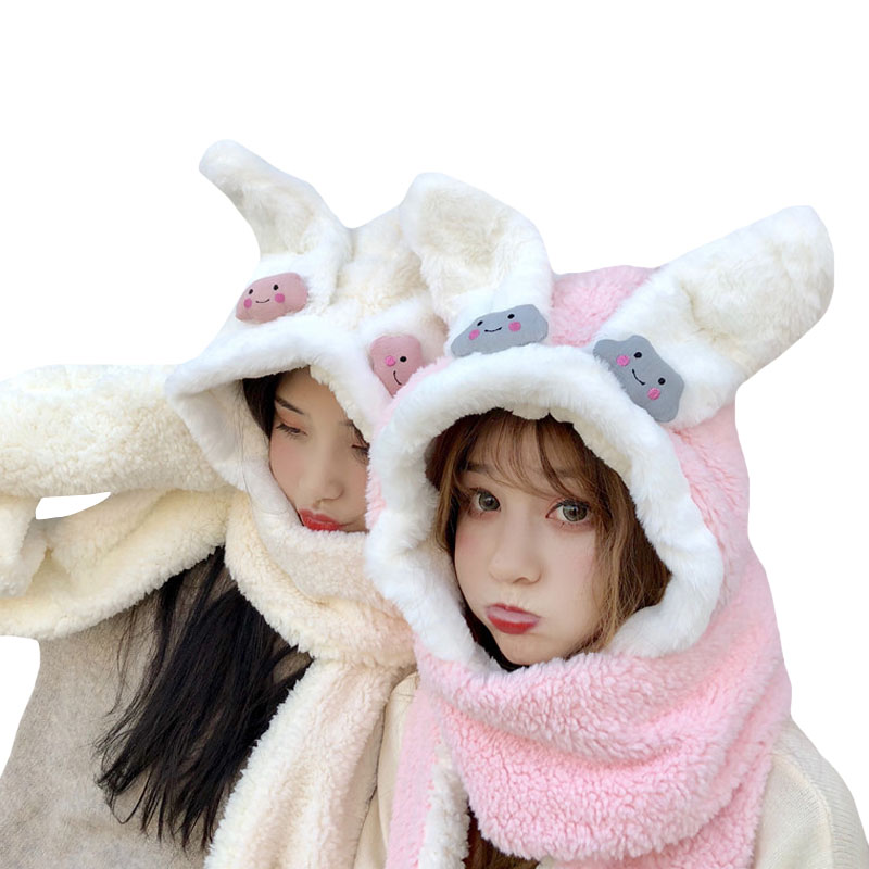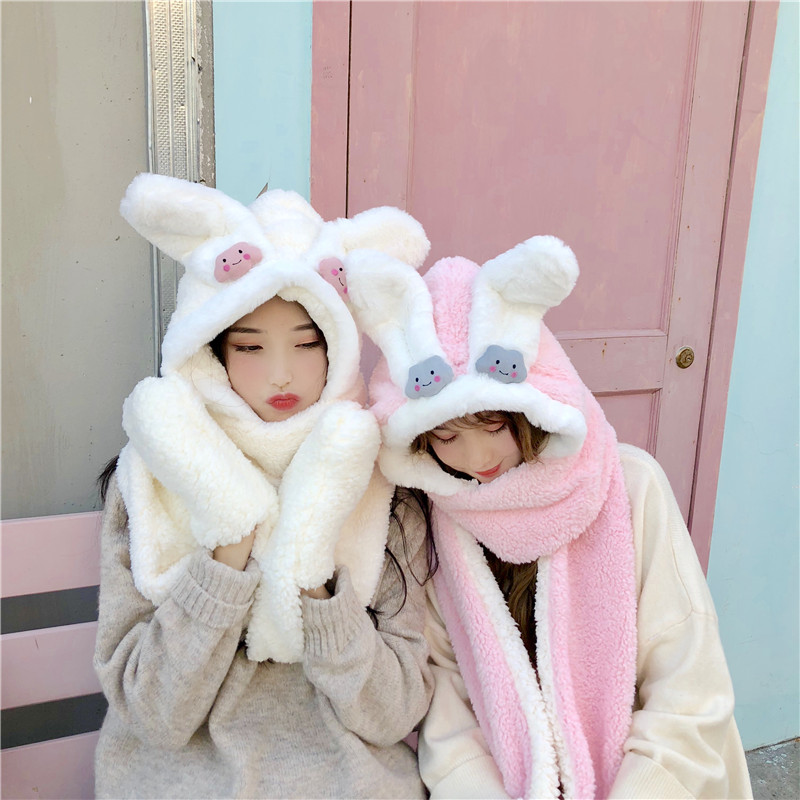/ 秋冬韓版加厚保暖護耳連帽圍脖網紅可愛毛絨絨兔耳朵帽子女士學生