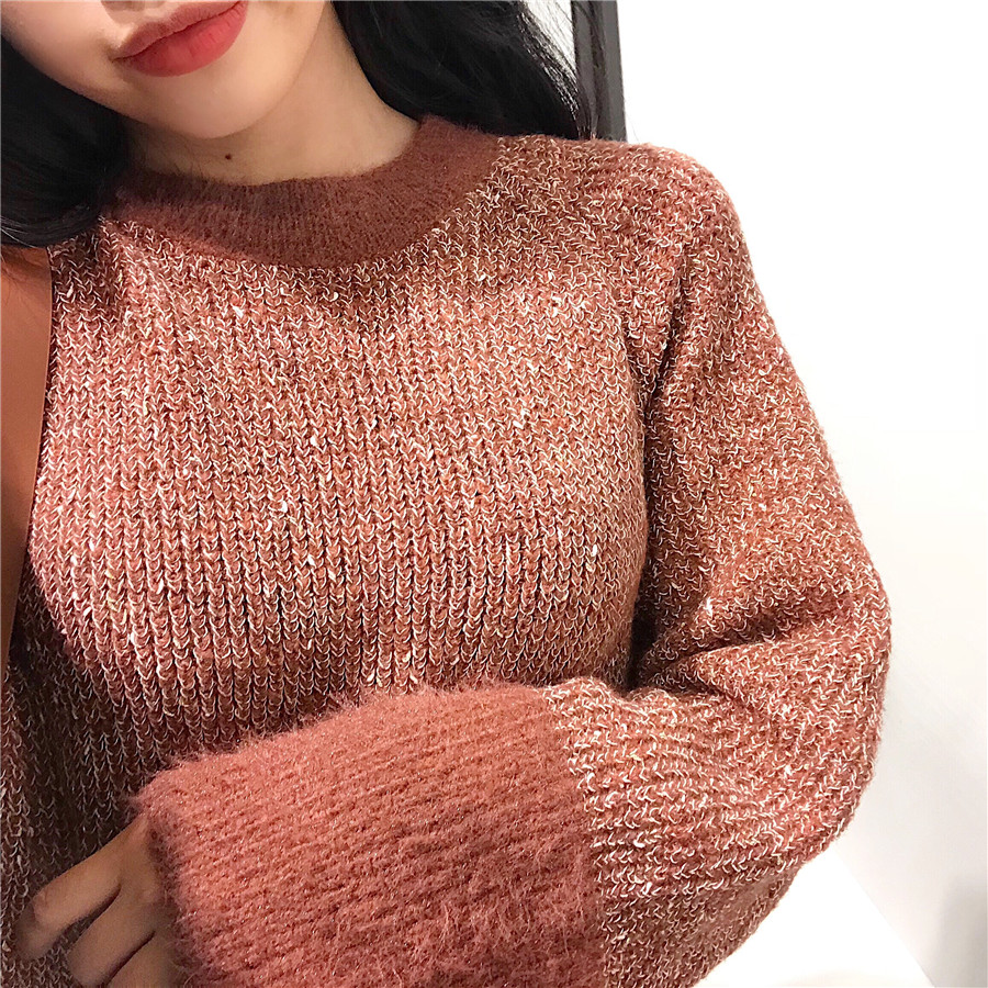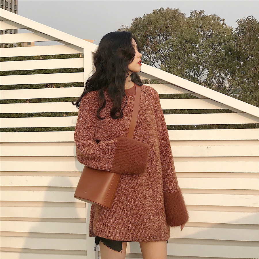 慵懶風套頭毛衣女2018新款秋冬韓版復古色系純色撞色圓領寬松上衣