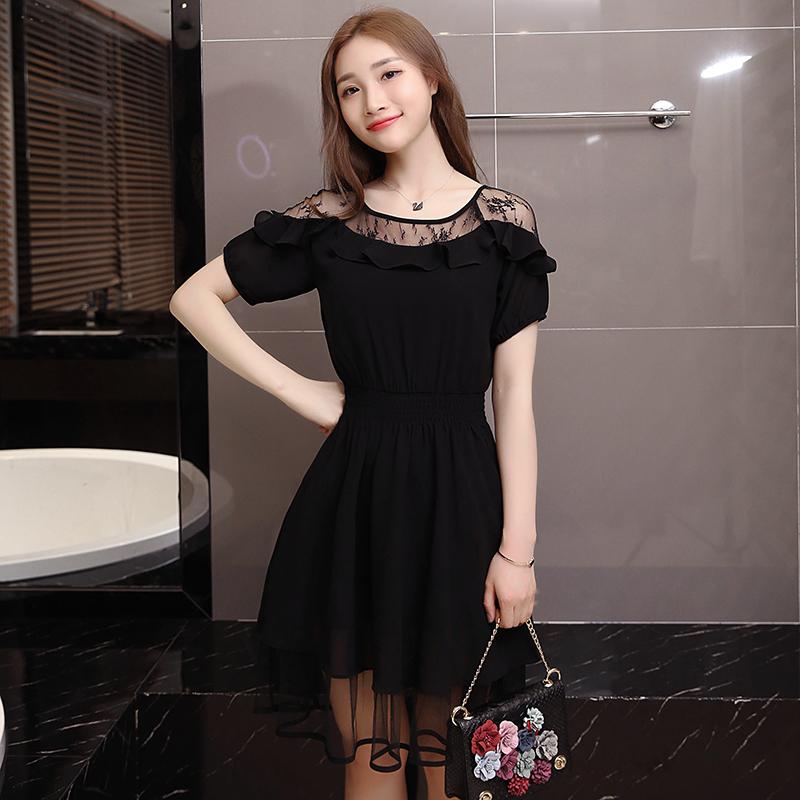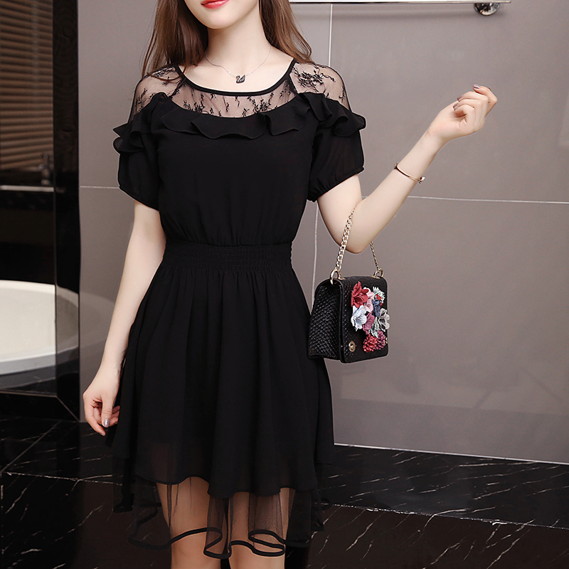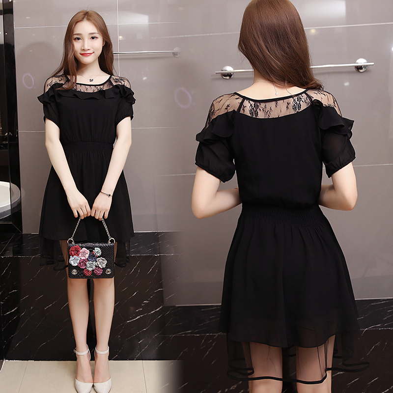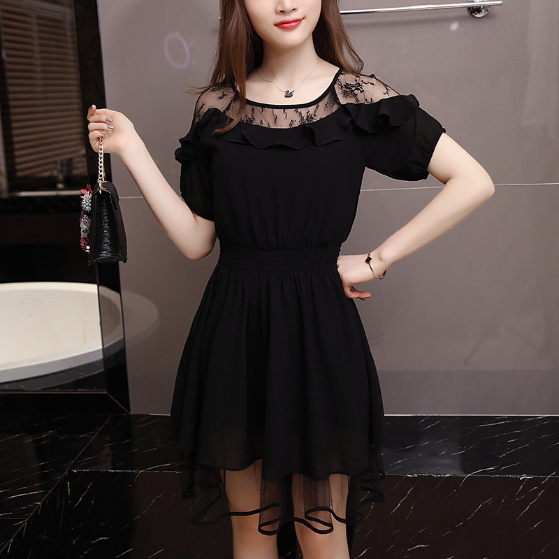 / 夏裝新款韓版短袖荷葉邊中裙修身顯瘦蕾絲拼接雪紡連衣裙子潮
