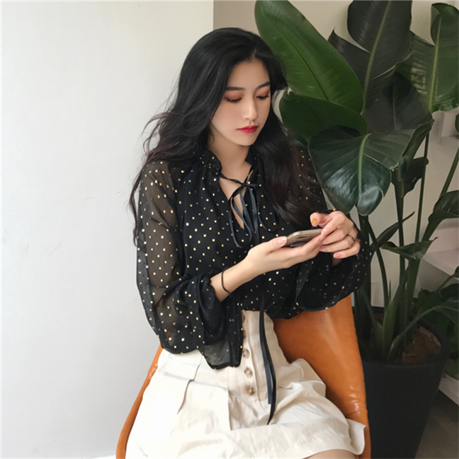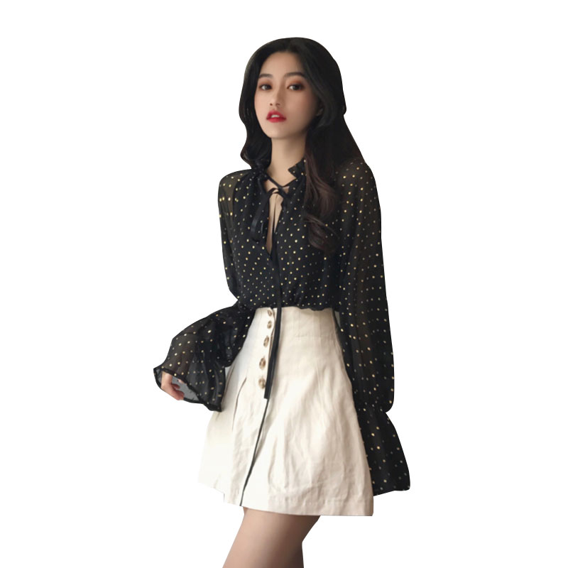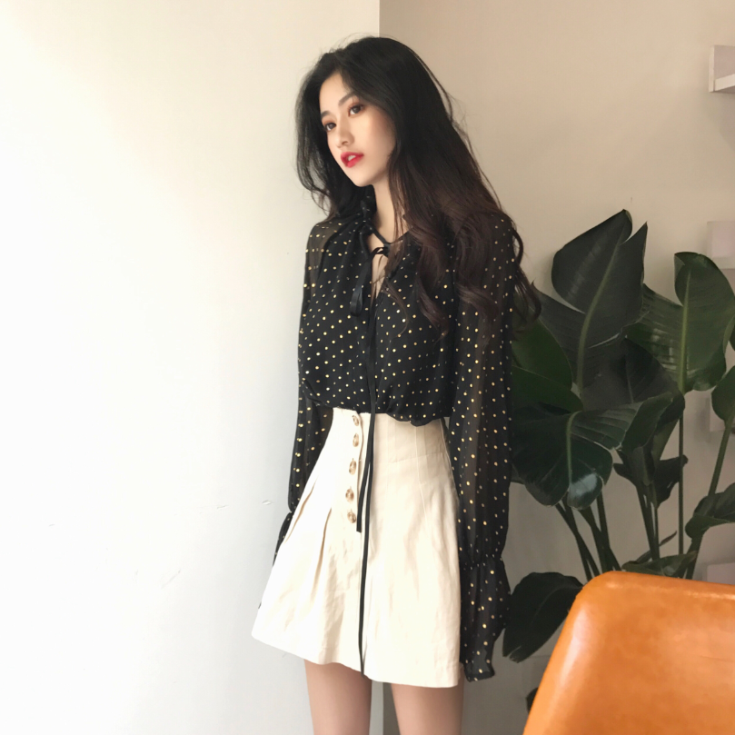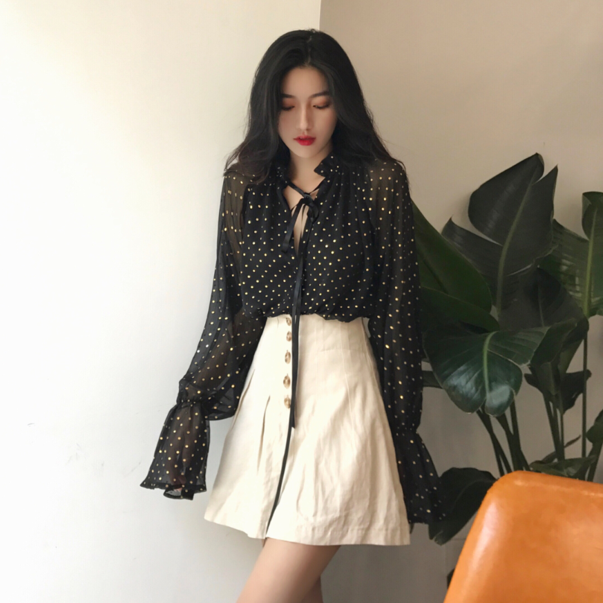 / chic時尚早秋上衣慵懶氣質百搭韓版黑色波點寬松顯瘦喇叭長袖襯衫