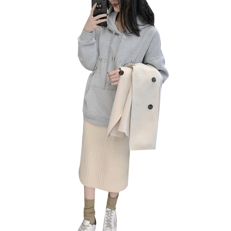 / 女神套裝秋冬新款2018流行毛呢外套加絨連帽衛衣高腰針織半身裙子