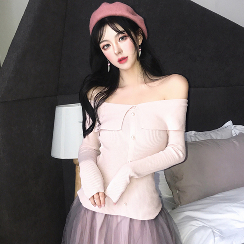 / 一字露肩修身顯瘦打底針織衫女秋冬裝新款學生復古風長袖白色上衣