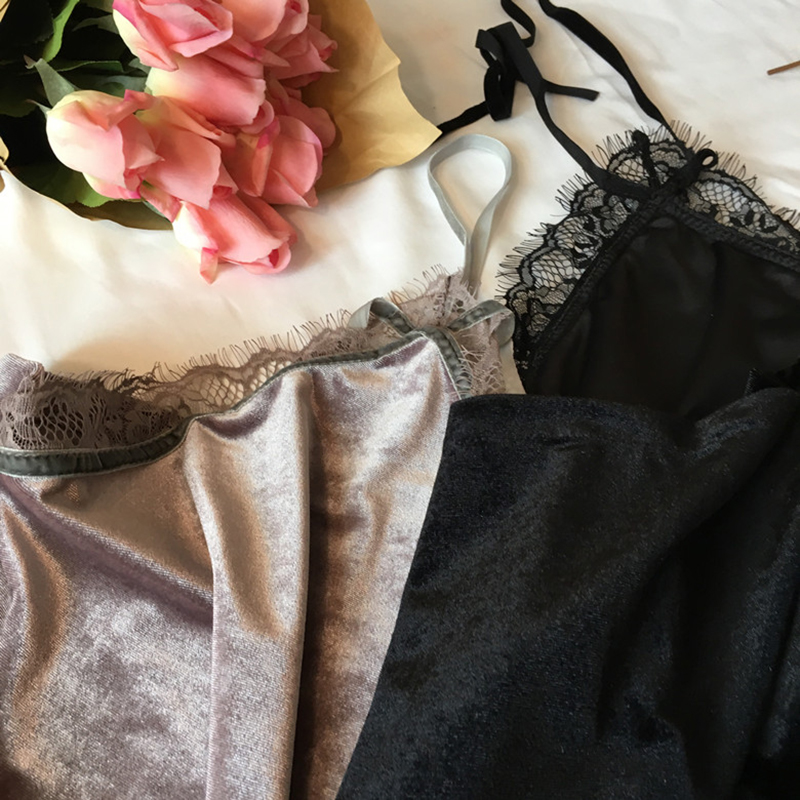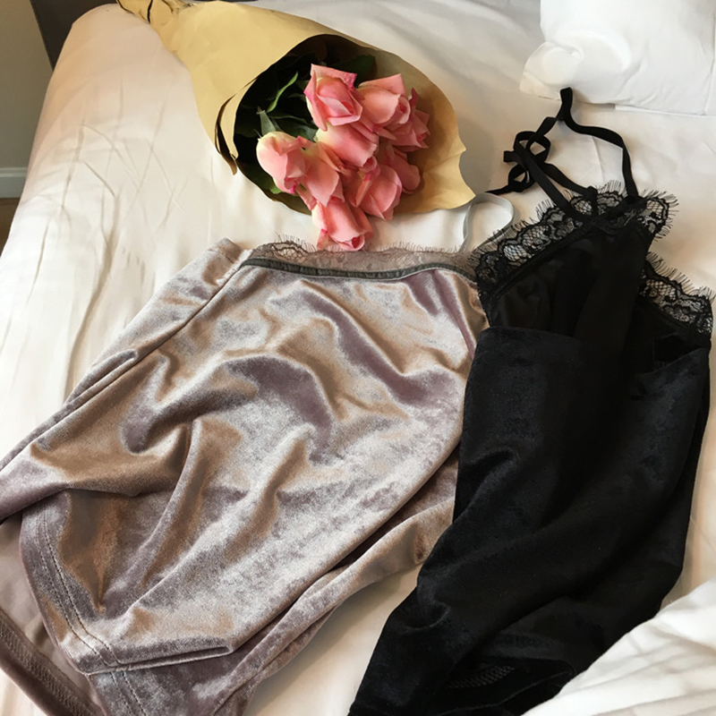 / 秋冬新款女裝修身蕾絲花邊拼接絲絨掛脖打底吊帶肚兜學生短款背心
