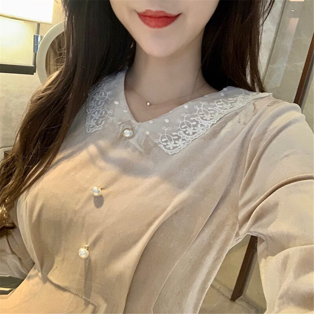 / chic早秋裙子長裙女慵懶風韓版百搭娃娃領絲絨蕾絲顯瘦長袖連衣裙