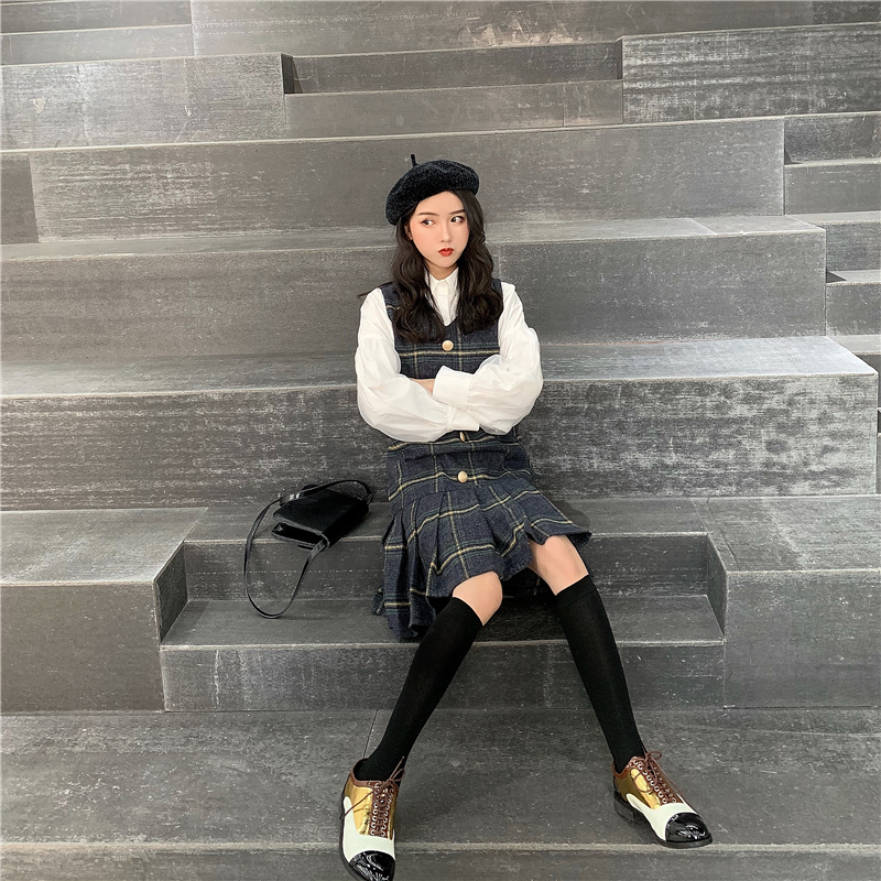 / 復古v領無袖格子連衣裙時尚套裝港味網紗喇叭袖襯衫上衣兩件套女