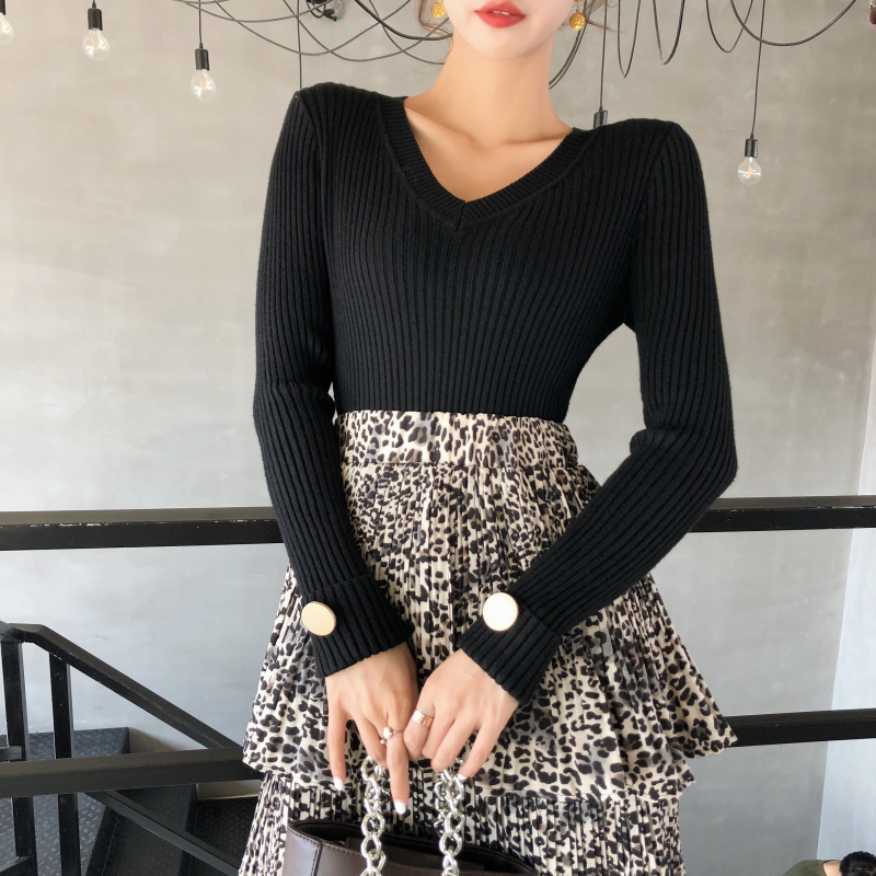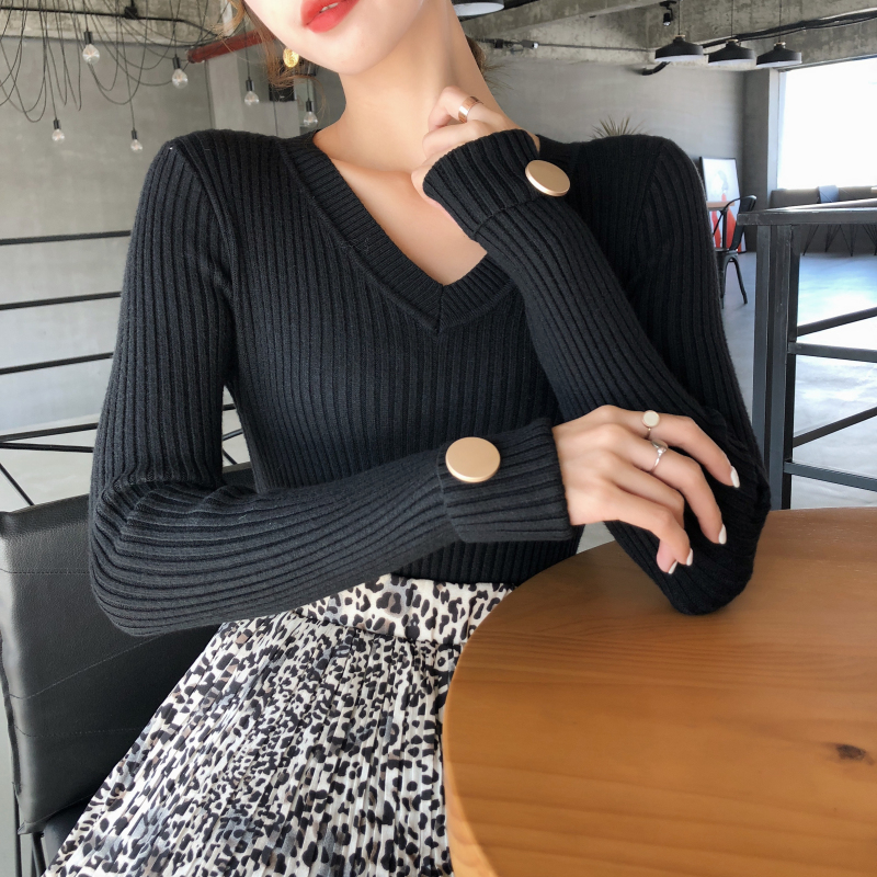 / 初秋溫柔風毛衣純色修身V領袖口紐扣針織衫套頭加厚長袖女上衣潮