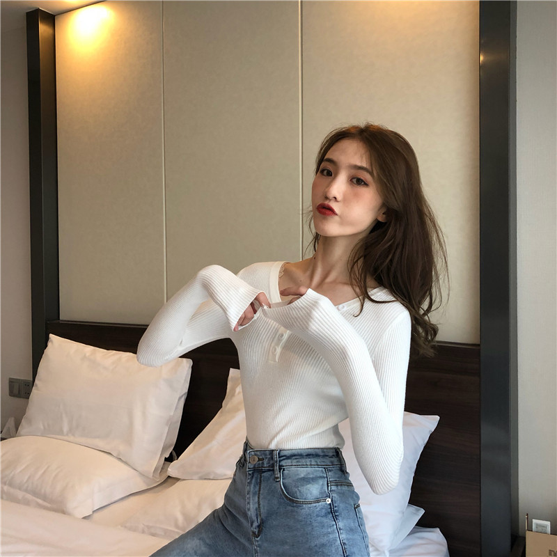 復古chic慵懶風毛衣女2018新款方領長袖T恤女修身顯瘦打底針織衫