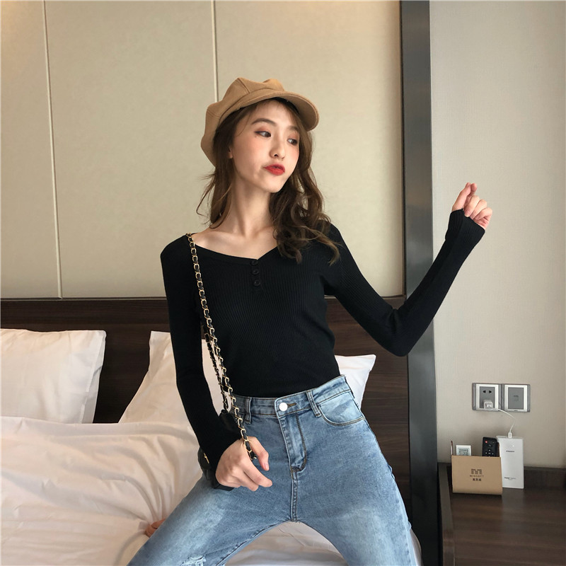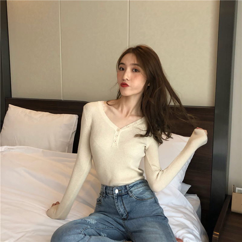 毛衣女2018新款時尚韓版V領純色套頭修身顯瘦紐扣長袖打底衫上衣