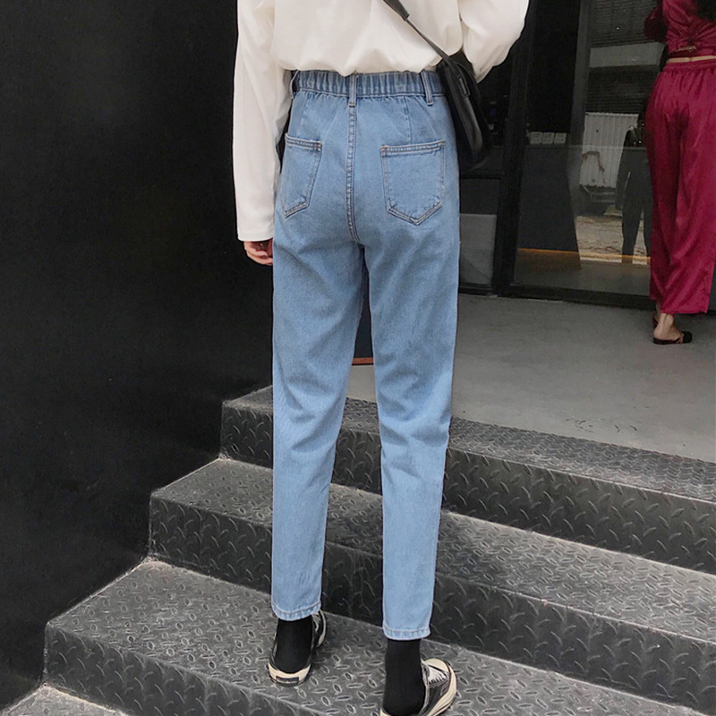 秋裝女2018新款韓版松緊高腰淺藍色牛仔哈倫褲子學生寬松直筒褲潮
