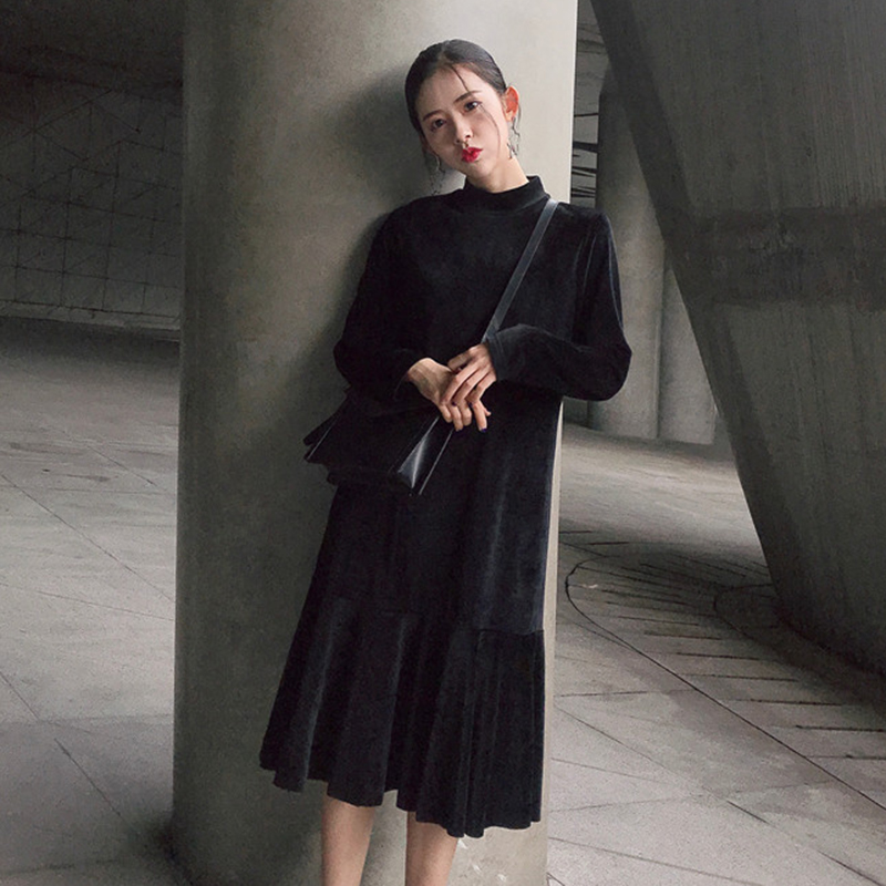 氣質絲絨長袖黑裙子秋裝女2018新款時尚半高領中長裙荷葉邊連衣裙