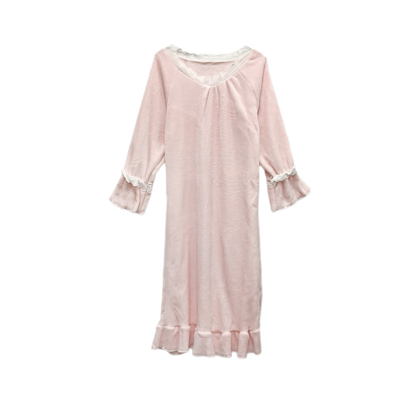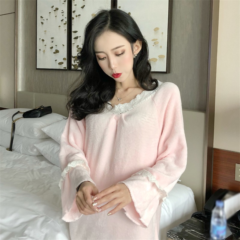 秋裝韓版時尚毛絨絨加厚荷葉邊長袖睡衣連衣裙睡裙家居服女士長裙