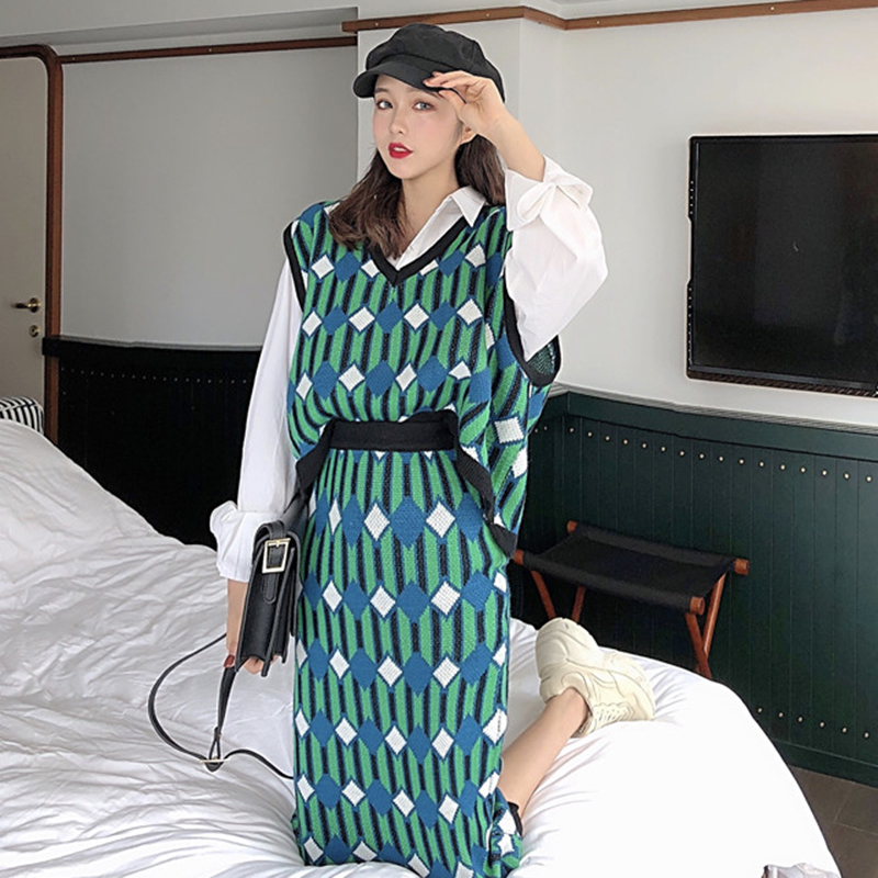 早秋時尚兩件套女裝2018新款復古幾何無袖針織衫氣質高腰半身裙子