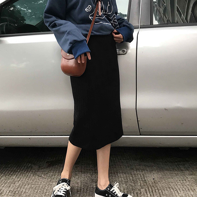/ 半身裙女秋裝2018新款學生百搭高腰中長裙復古時尚開叉包臀針織裙