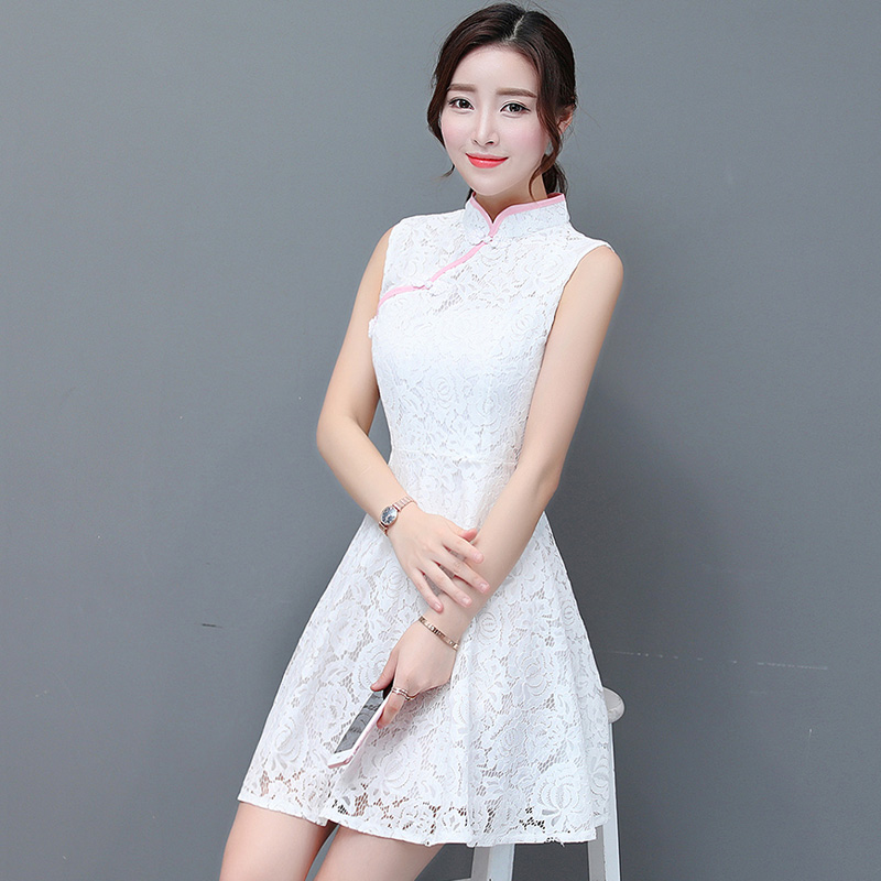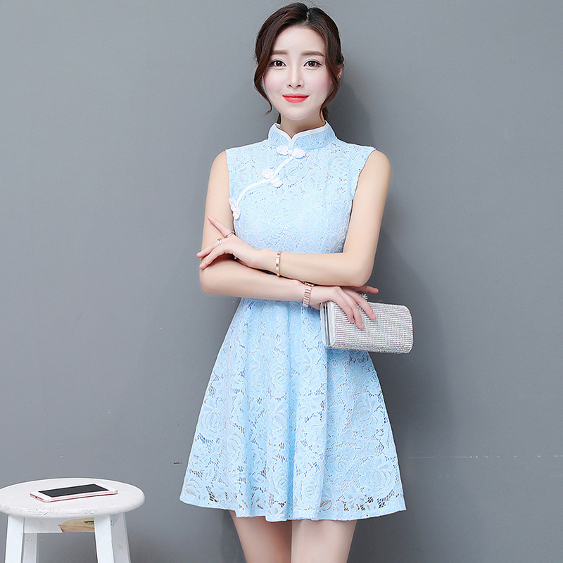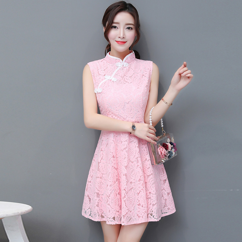 / 新款復古無袖旗袍式高腰淑女蕾絲a字連衣裙時尚氣質