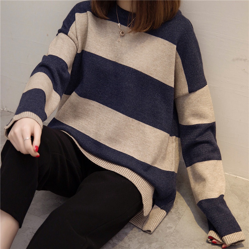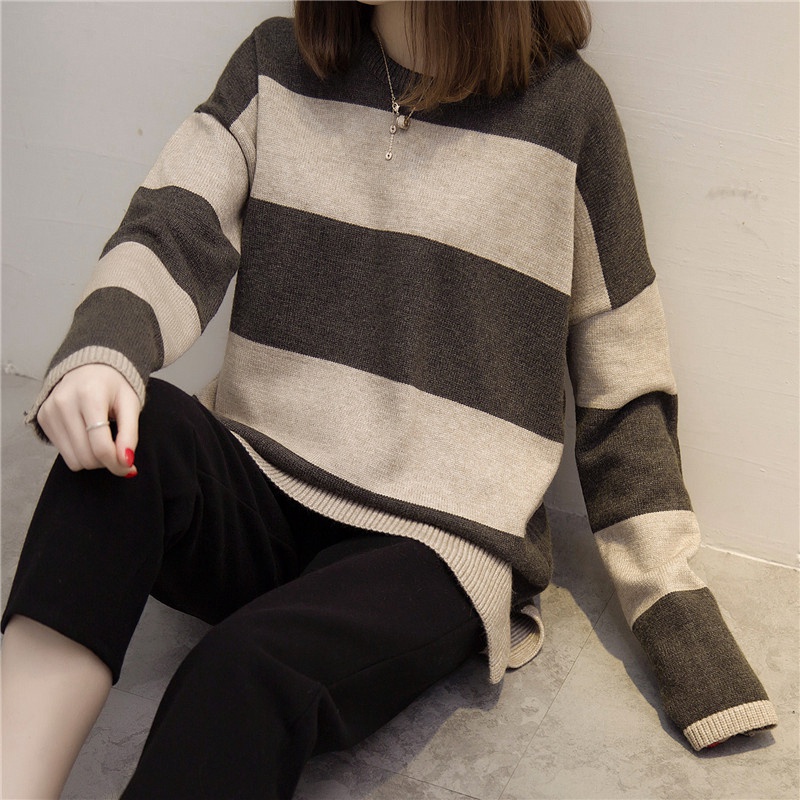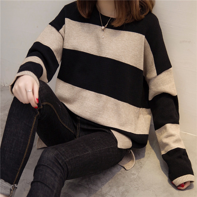 / 冬裝新款套頭毛衣女條紋韓版寬松學生針織衫打底衫秋冬女裝潮