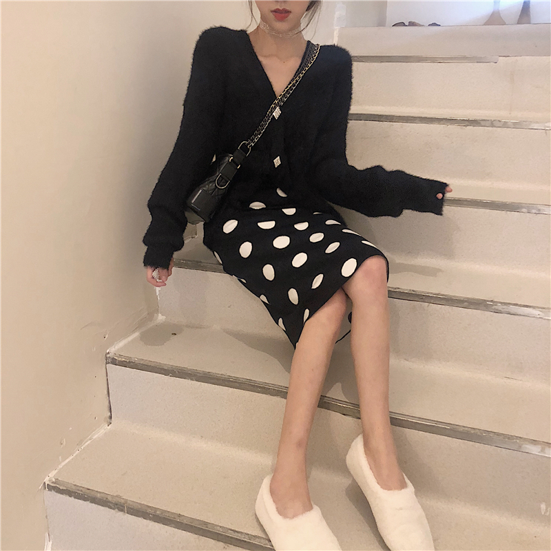 慵懶風網紅馬海毛針織開衫女+高腰針織包臀波點半身裙時尚兩件套