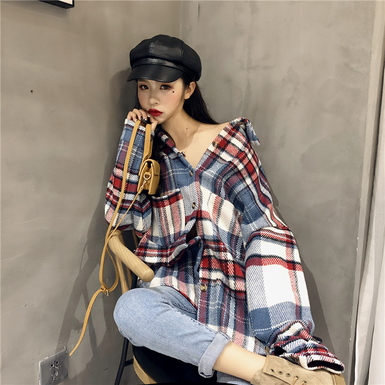 / 港風顯瘦oversize新款韓版寬松氣質慵懶格子泡泡袖毛呢襯衫外套女