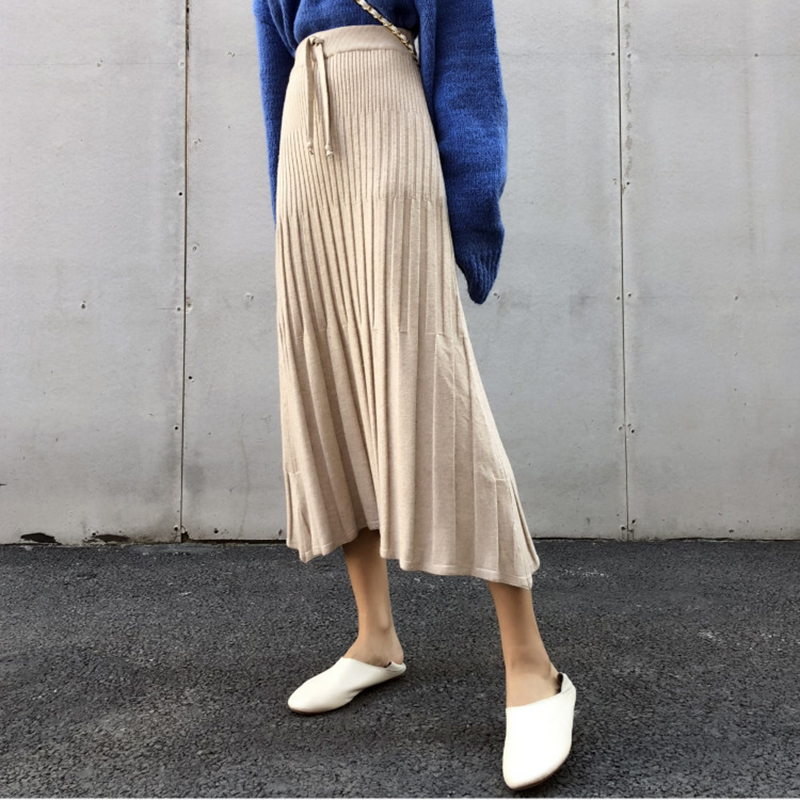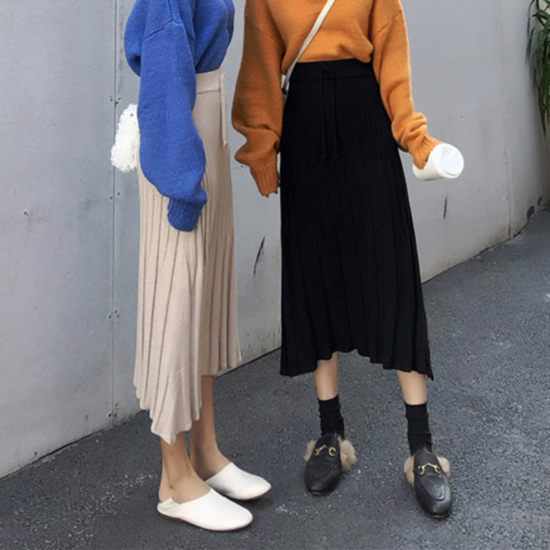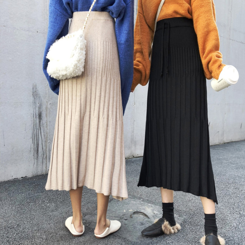 / 學院風高腰黑色針織半身裙子女秋冬裝新款復古顯瘦百褶A字中長裙
